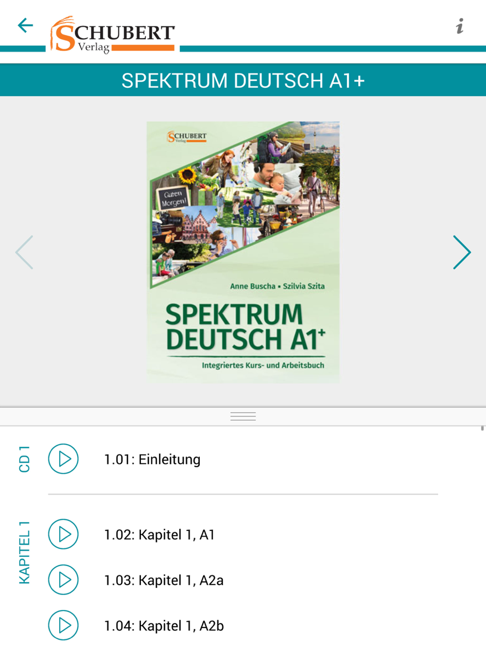 SCHUBERT-Audio allows you to play all the audio tracks from our textbooks and digital supplemental material on your mobile device. At this time, all audios from SPEKTRUM DEUTSCH A1⁺, SPEKTRUM DEUTSCH A2⁺, SPEKTRUM DEUTSCH B1⁺, SPEKTRUM DEUTSCH B2, Begegnungen DaF A1⁺, Begegnungen DaF A2⁺, Begegnungen DaF B1⁺, Erkundungen B2, Erkundungen C1, Erkundungen C2, A-Grammatik, Geschäftliche Begegnungen A2⁺, Geschäftliche Begegnungen B1⁺, Sag Hallo!, Schulzeit für Eltern are available.