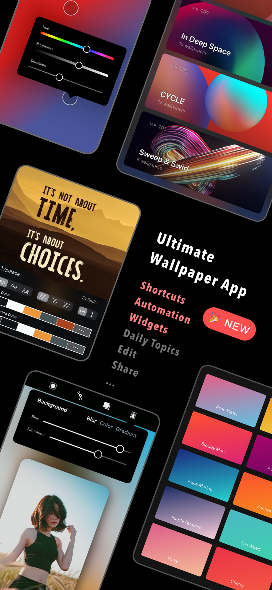 - Gradient: Get beautiful colored gradients from 200+ gradients, or create gradient wallpapers with any color you like.