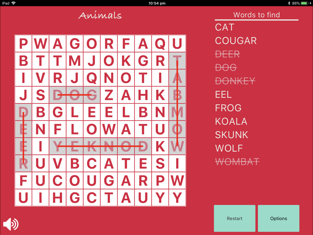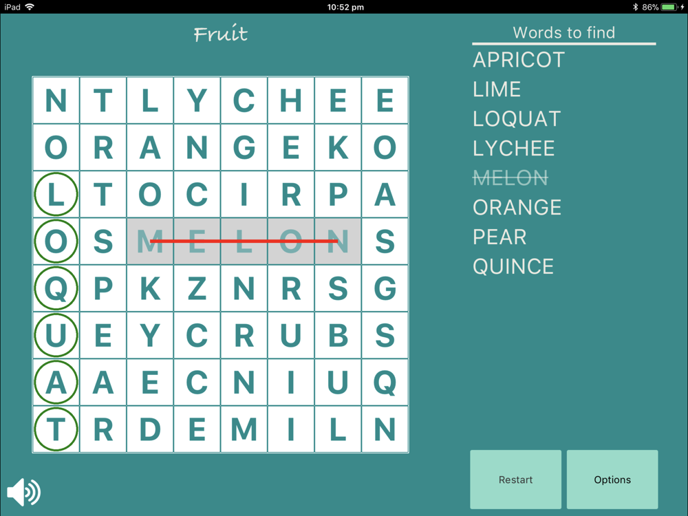 Simple word search app aimed for young children. Simply locate the word, currently restricted to left-right or top-bottom directions, select each letter and then select the word in the list.