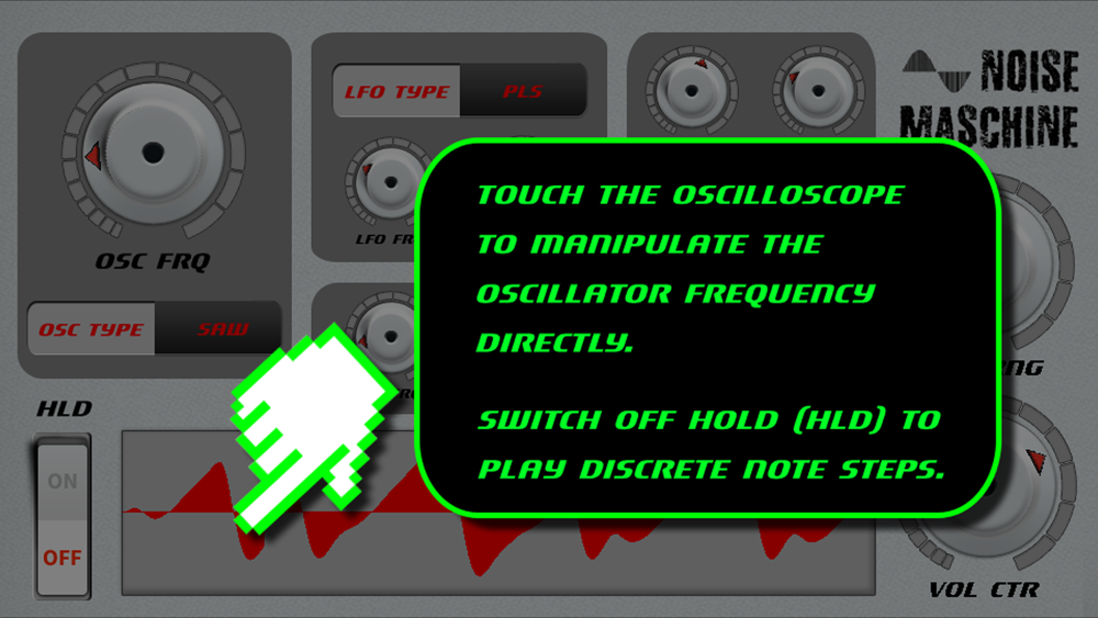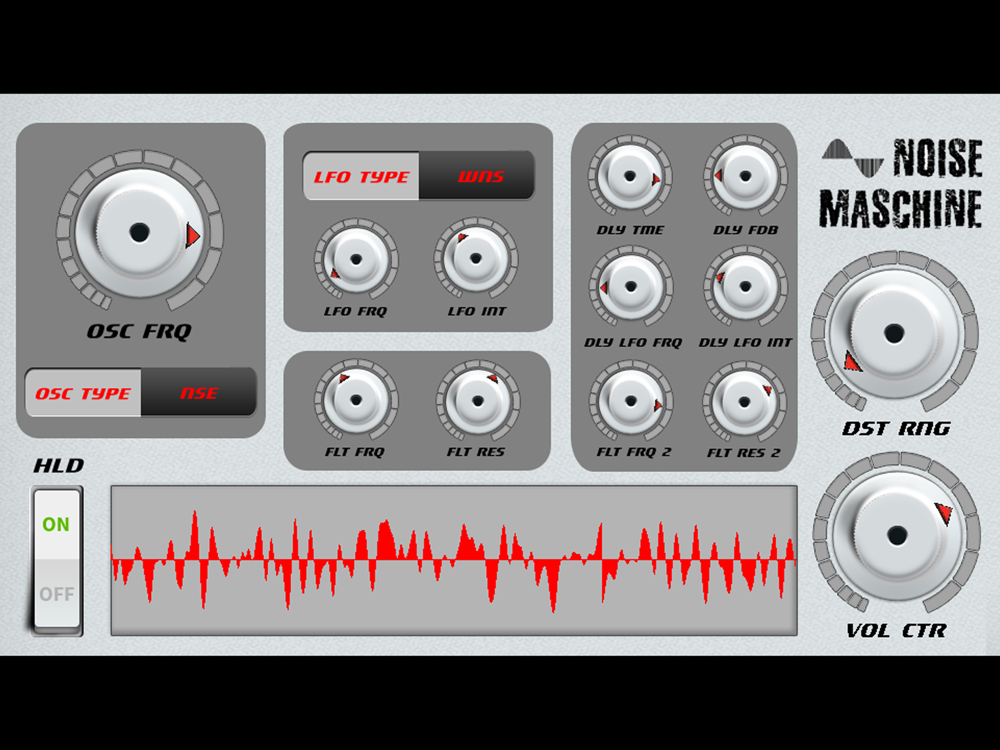 Touch the oscilloscope graph to control the OSC directly. Switch HLD off to play discrete note steps (to be used for any waveform except NSE and WNS Waves). Delay section includes a dedicated LFO and additional Filter. Control distortion range as is, no additional clipping or filtering applied to produce pure digital noize - no analogue emulation hidden inside.