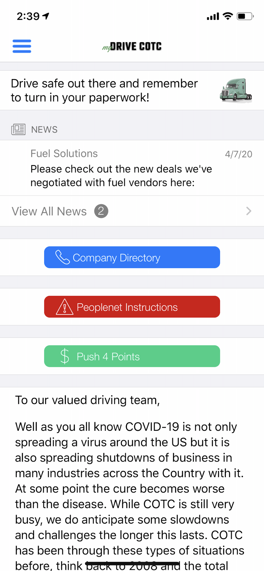 My Drive will improve communications regarding pre-planned loads, current load status, routing solutions, accident re-training, payroll, benefits, and so much more! In addition, to enhancing the ease of turning in delivery paperwork, inspection reports, medical long-form, new license, and other important documents.