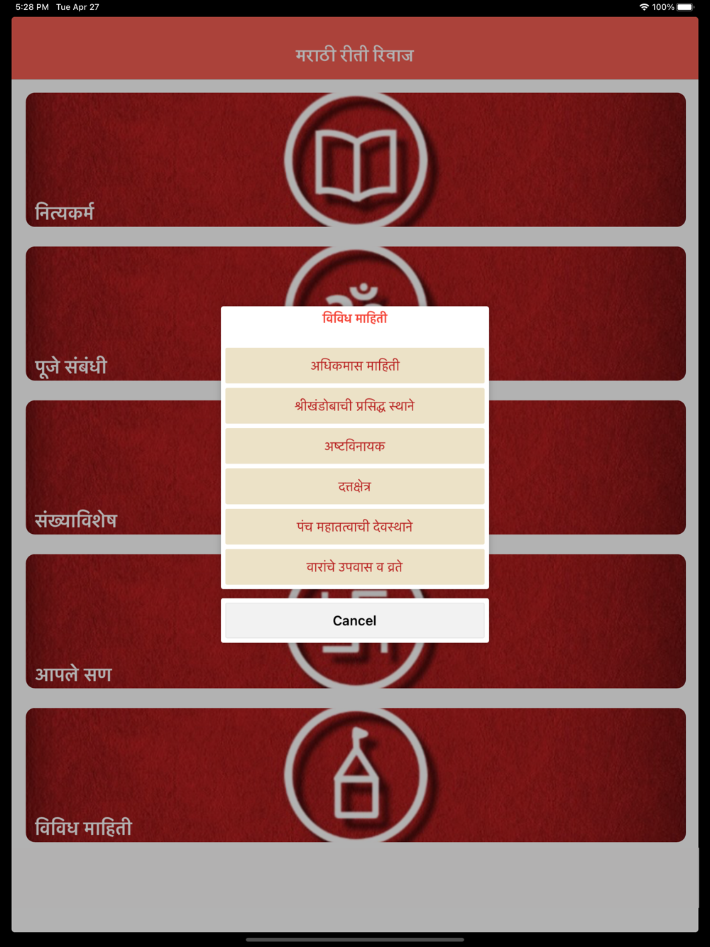 Aarti, Mantra, Shlok, Stotra, Panchang are now easily available in one click. Information related to Marathi Sanskriti/culture is included in this mobile app. This app works offline as well. I.e. Once this app is downloaded on your mobile, there is no need for Internet.