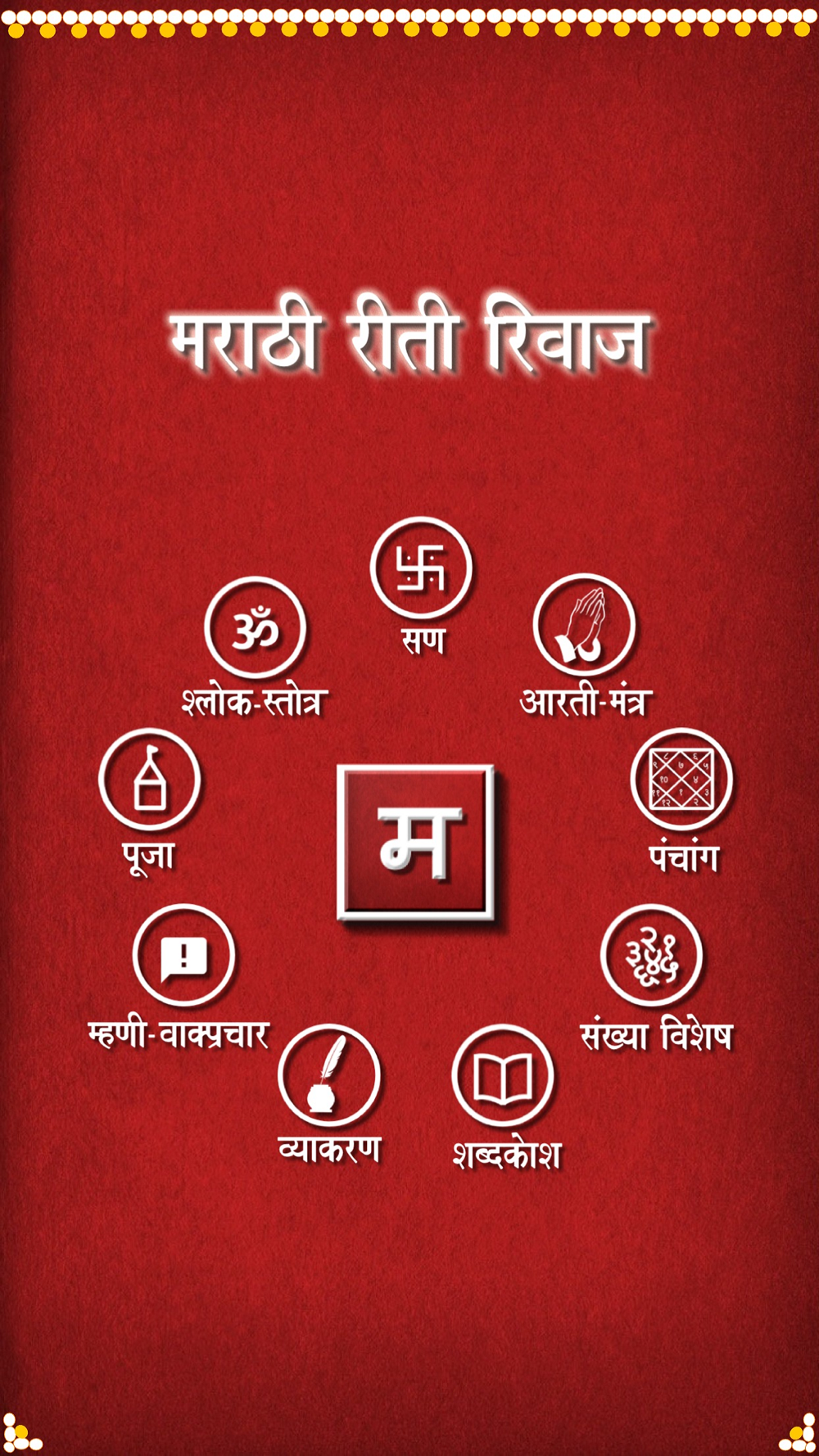 “Marathi Riti Rivaj” mobile app is an amazing collection of Marathi Sanskriti/Culture which consist of Mantra, Shlok, Stotra, Aarti Sangrah, Festivals, Fasting, Puja, Panchang, Vyakaran, Shabdkosh, Mhani, Vakprachar and much more information.