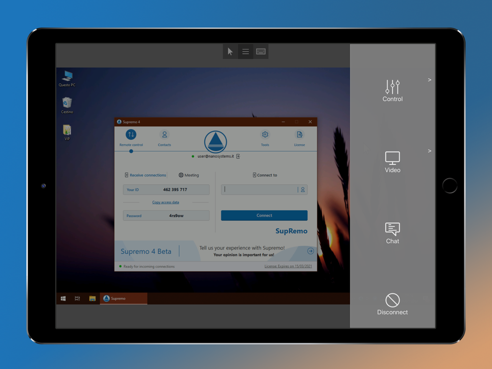 2. Download and launch Supremo for Windows from the PC/server you need to remote control, take note of ID and password