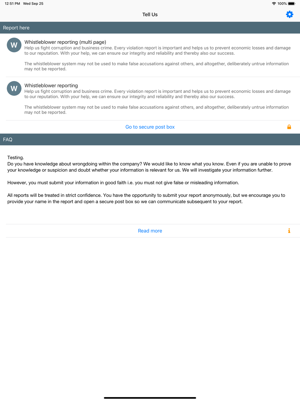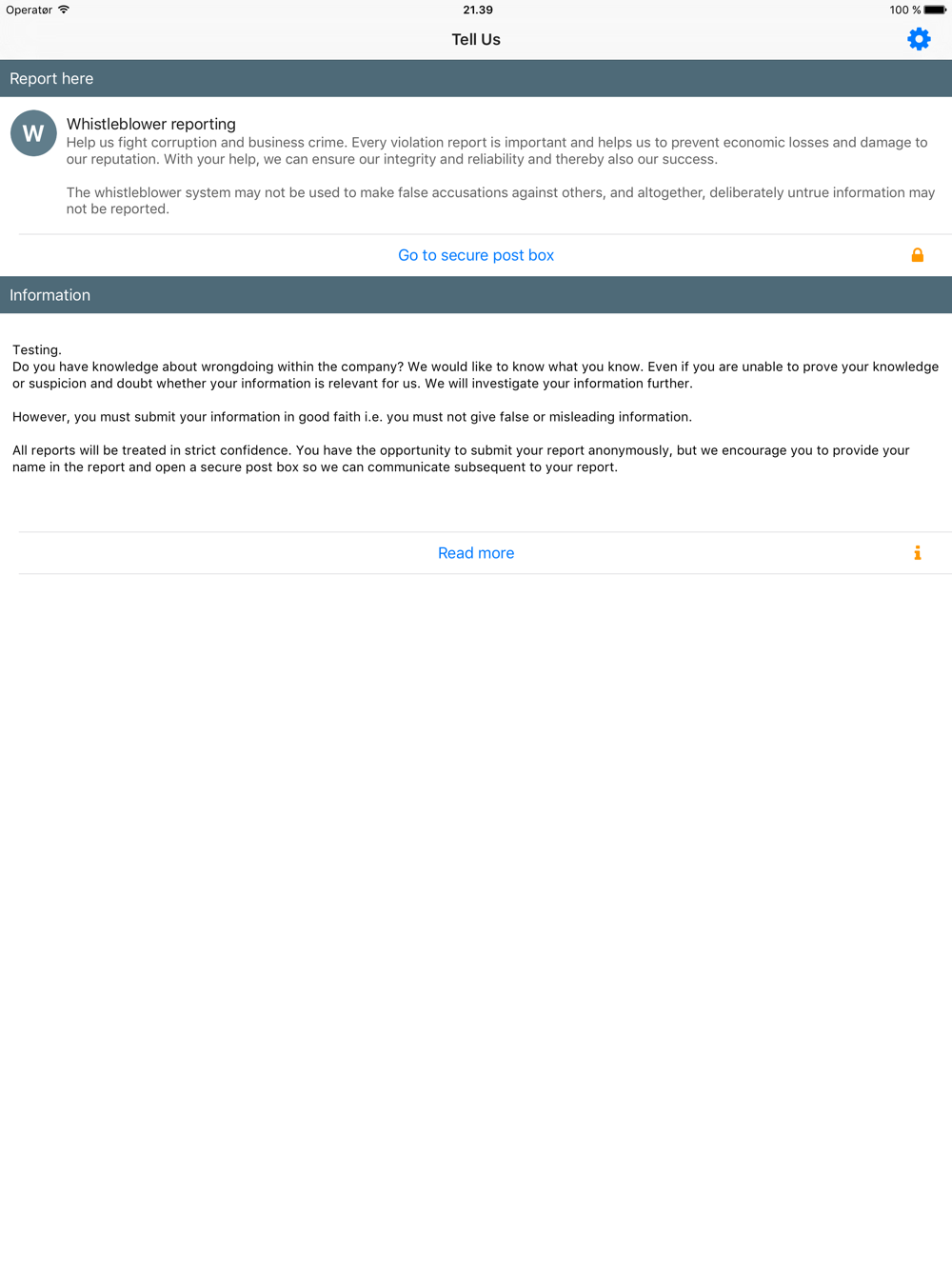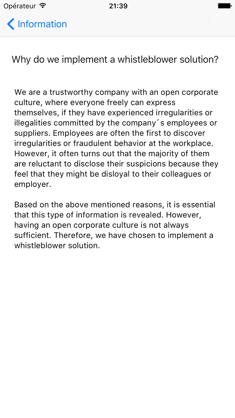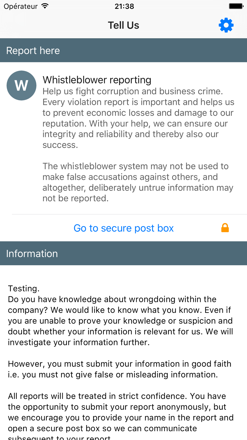 The app acts as a whistleblowing portal, letting you report whistleblowing concerns to your company completely anonymously from within the app.