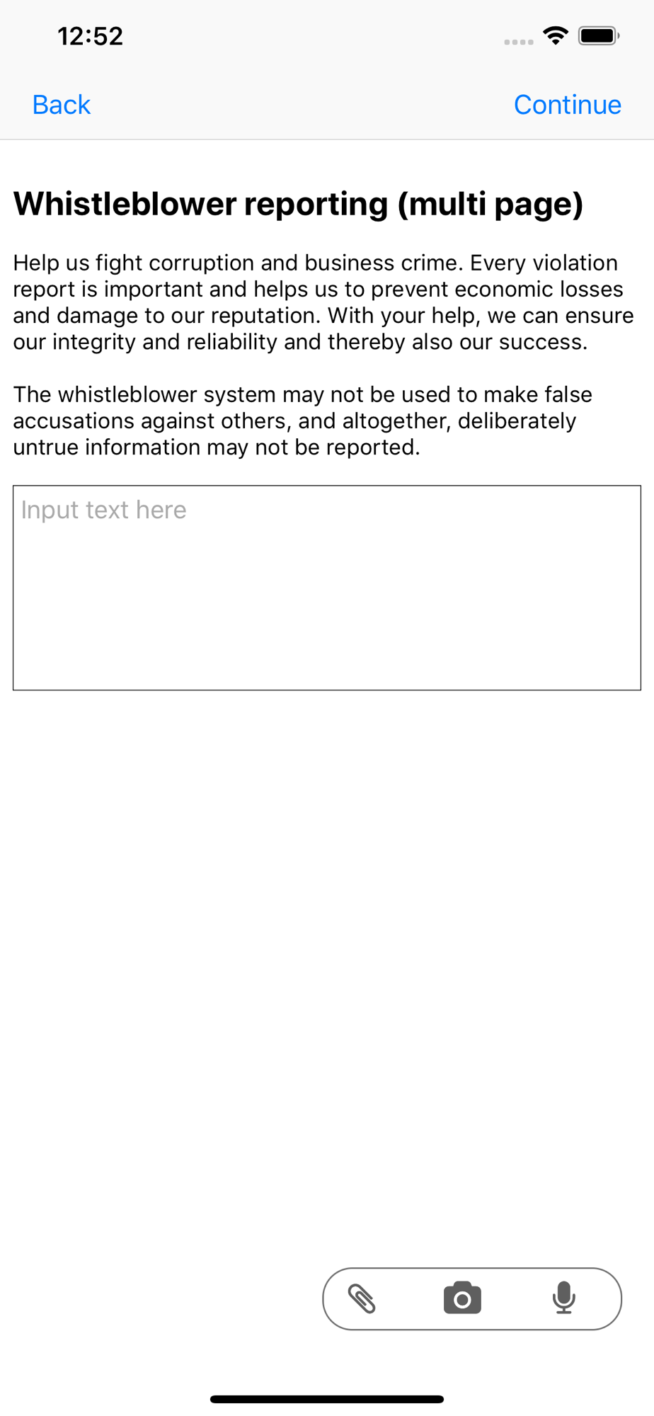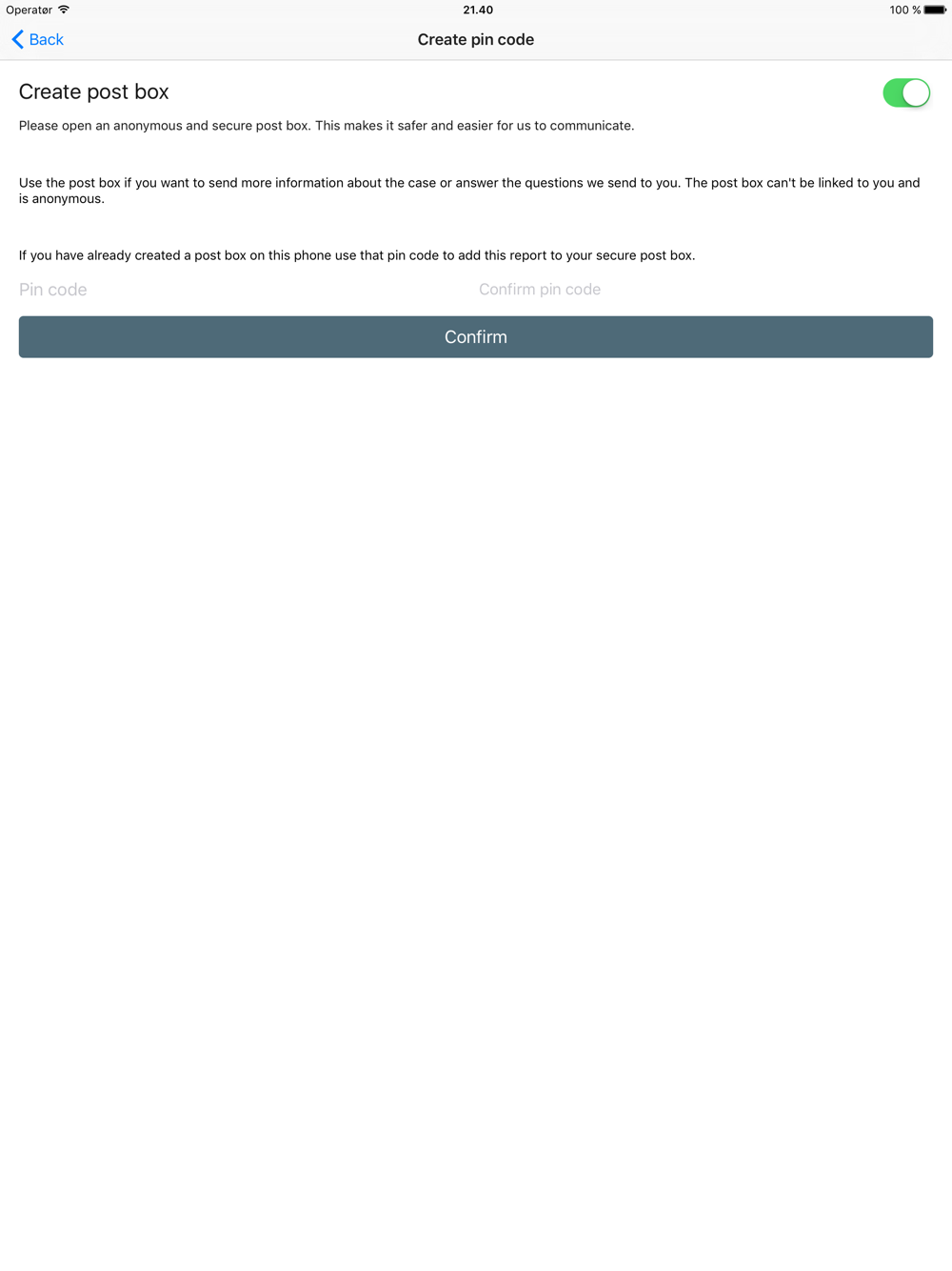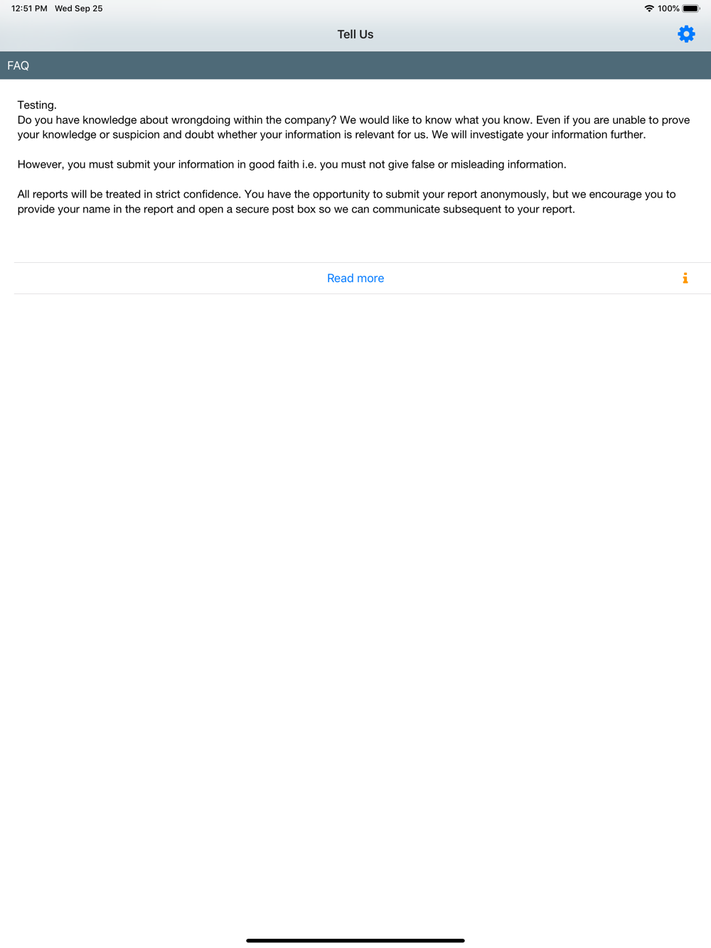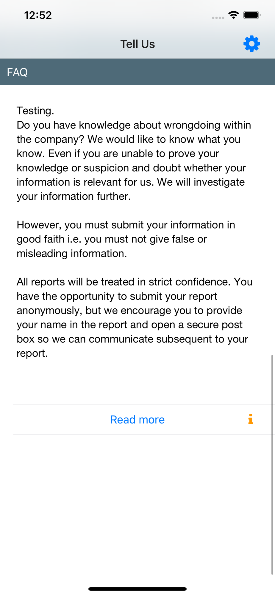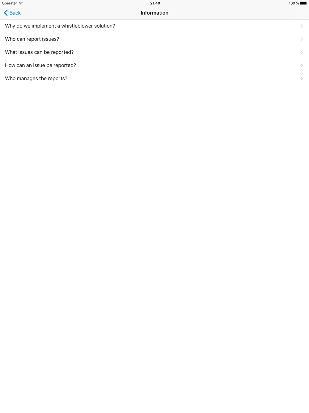 The app acts as a whistleblowing portal, letting you report whistleblowing concerns to your company completely anonymously from within the app.