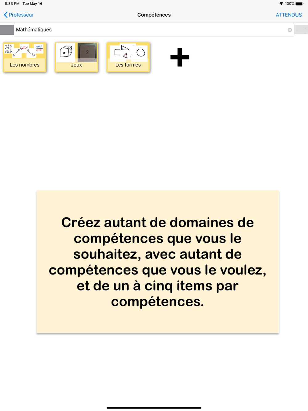 Mais, elle est aussi entièrement modifiable, notamment au niveau du choix des sections, des compétences, des items et prend même en compte jusqu'à 10 exercices/tests par items.L'application pourra s'adapter aux besoins de publics variés ( école, cycle, classe unique, enseignement spécialisé etc...)
