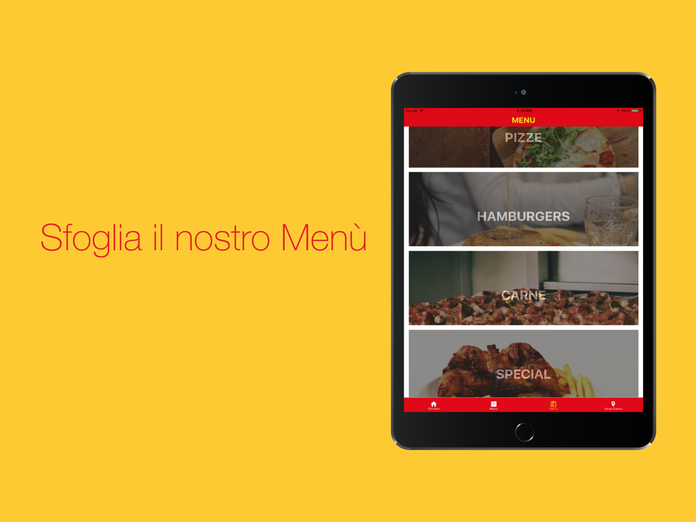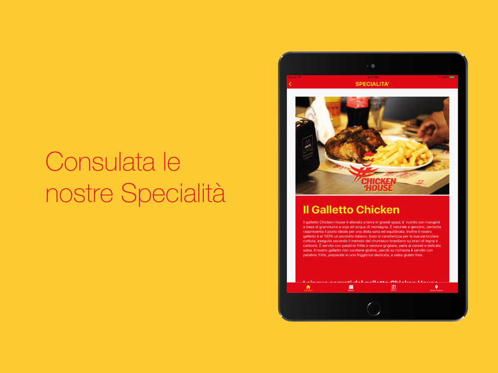 Sarà possibile sfogliare il Menù nel dettaglio con le specifiche sulle specialità della casa, la possibilità di Prenotare direttamente dall'App, aggiungendo al Carrello i piatti desiderati, oppure con il tasto Chiama interagire in maniera diretta con il locale. Infine, tramite il pulsante Naviga ricevere indicazioni da Google Maps per navigare dalla propria posizione fino da ChickenHouse.