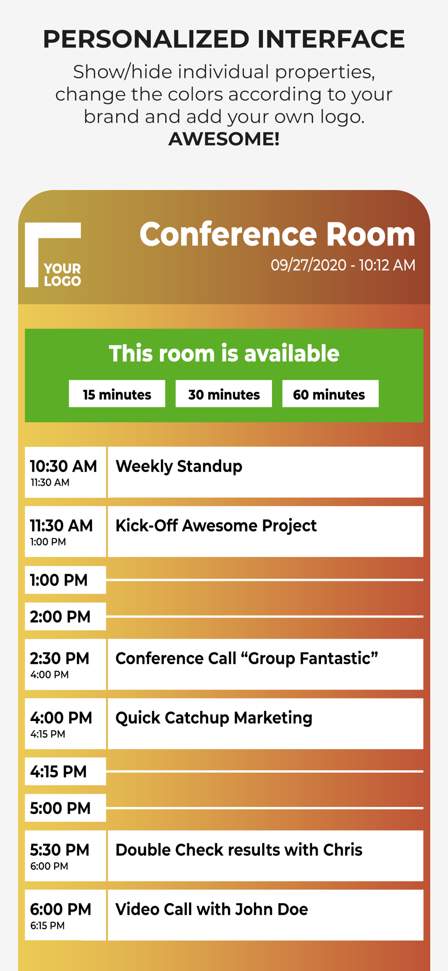 Use an iPad or iPhone outside of your conference rooms to show the day's schedule in your corporate design. ***Privacy is ensured.***
