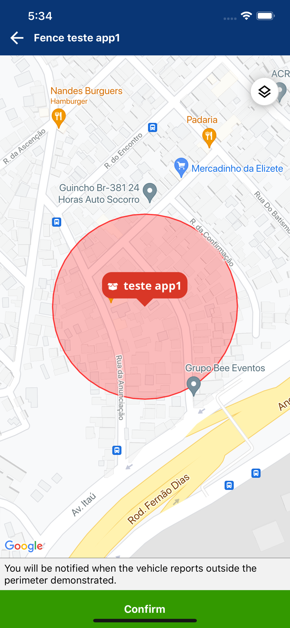 Você poderá gerenciar o evento de alerta de cerca que emitirá um alerta caso seu veículo saia do raio da cerca.