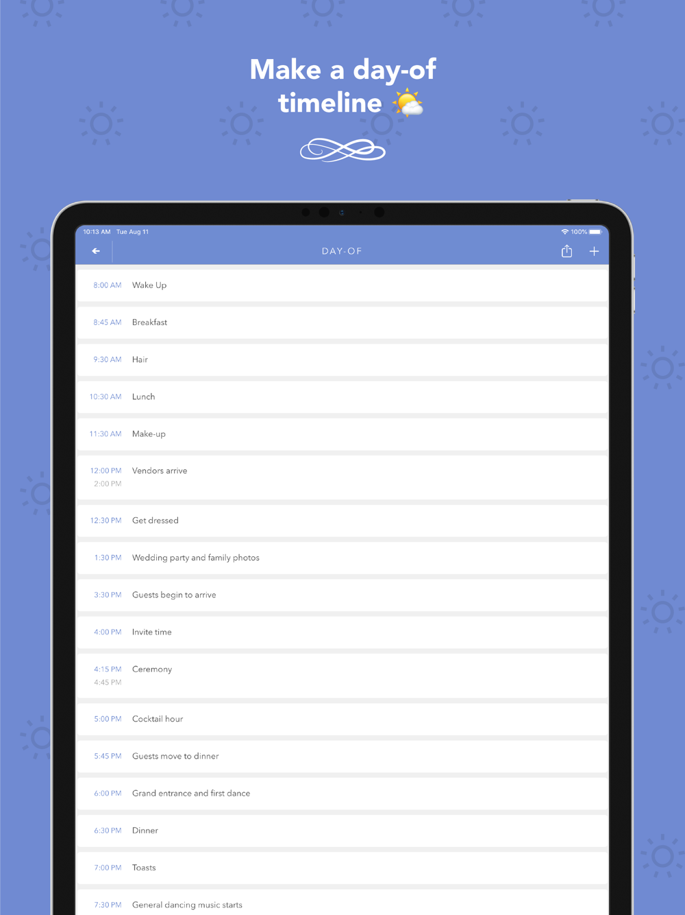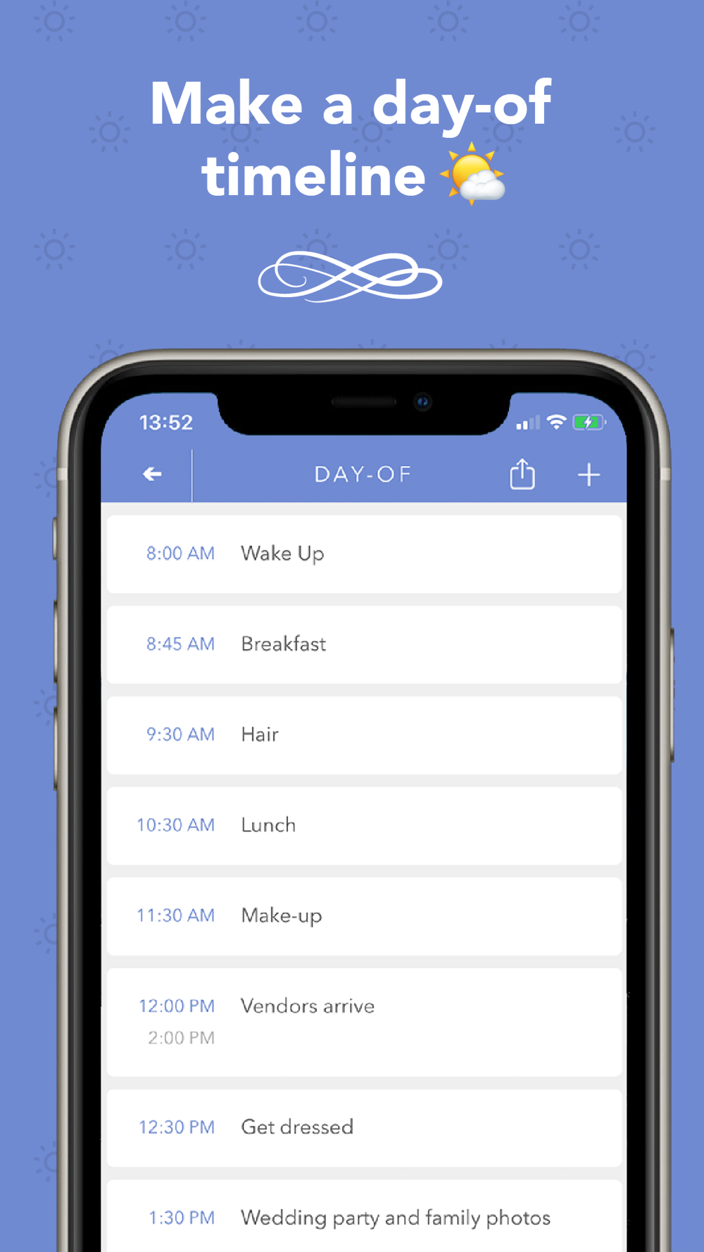 • Day-of: Plan the timeline of events on your wedding day and easily share it with vendors, friends, and family.