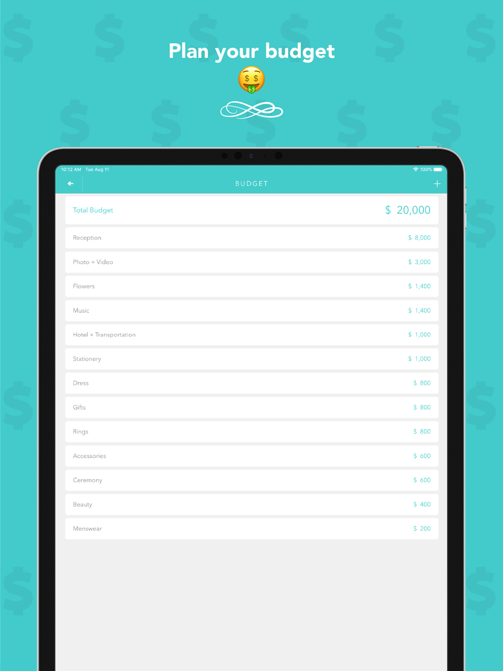• Budget: Set a budget and get an estimate of how much to spend on each expense.