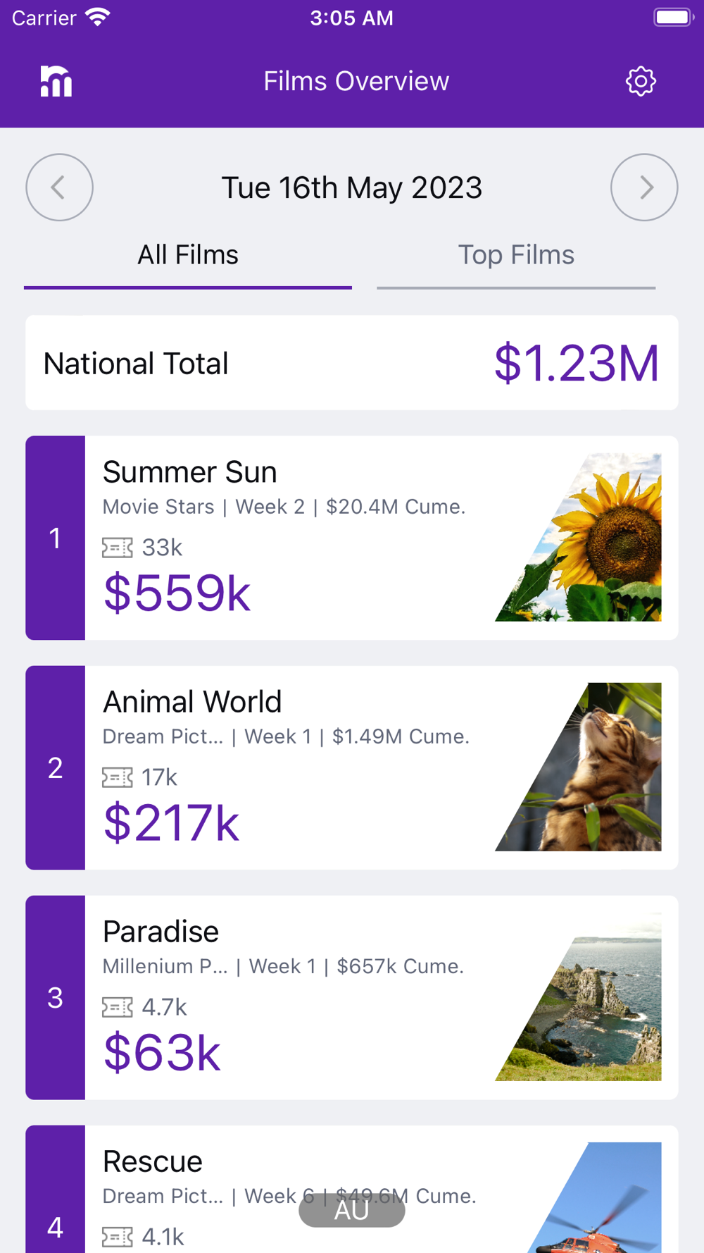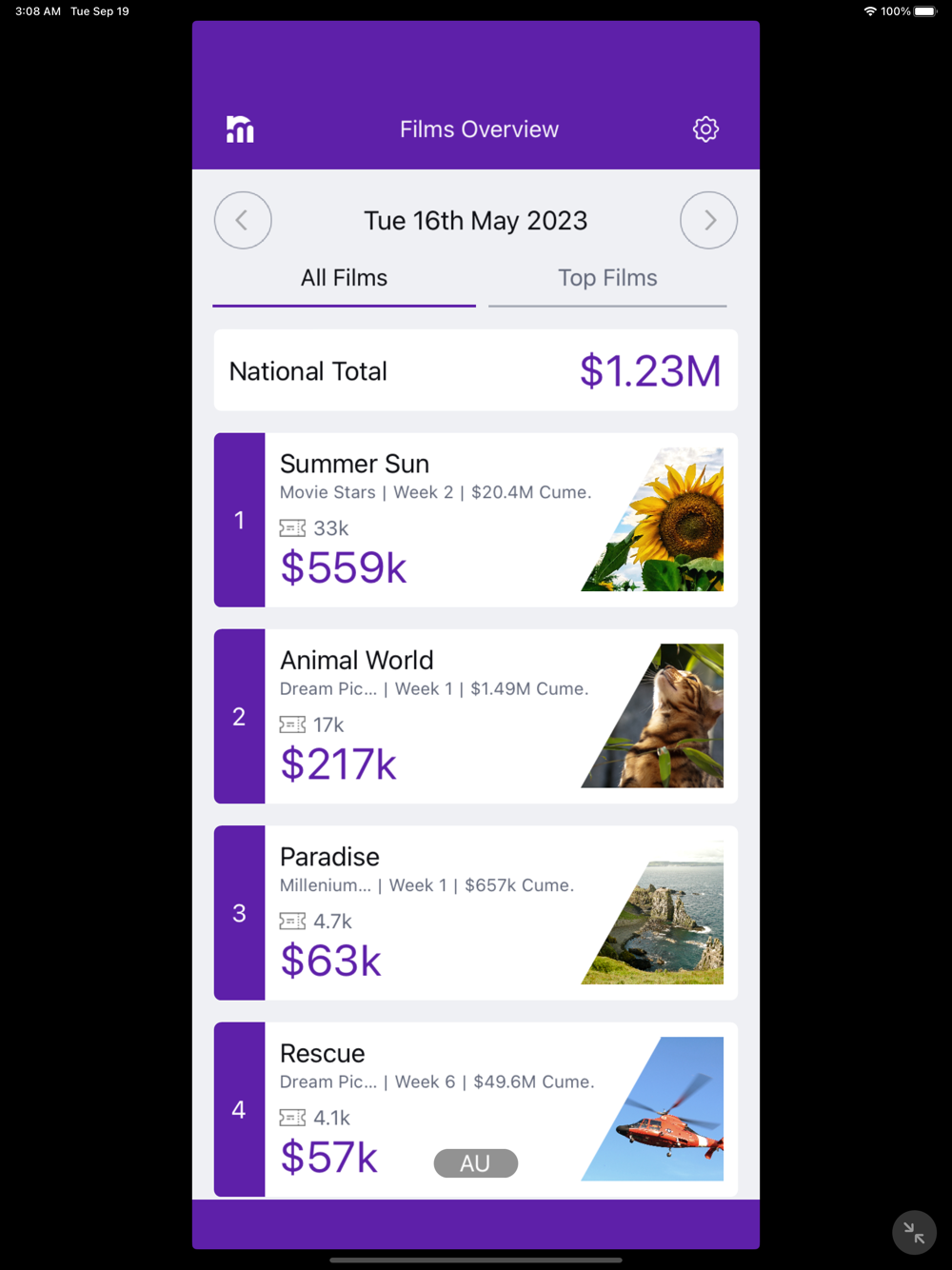 The Numero Box Office App delivers up to the minute box office results. Easily and quickly view Daily, Weekend, Weekly and LIVE box office reports, charts and comparisons titles from all of Numero's markets. A must for film industry executives wanting instant results in the palm of their hand.