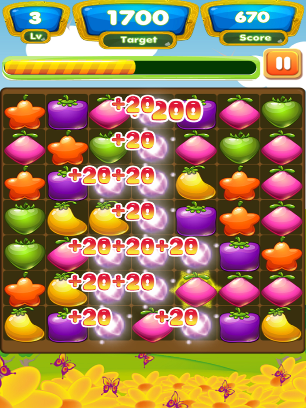 - Connect three or more same juice fruit to score points.