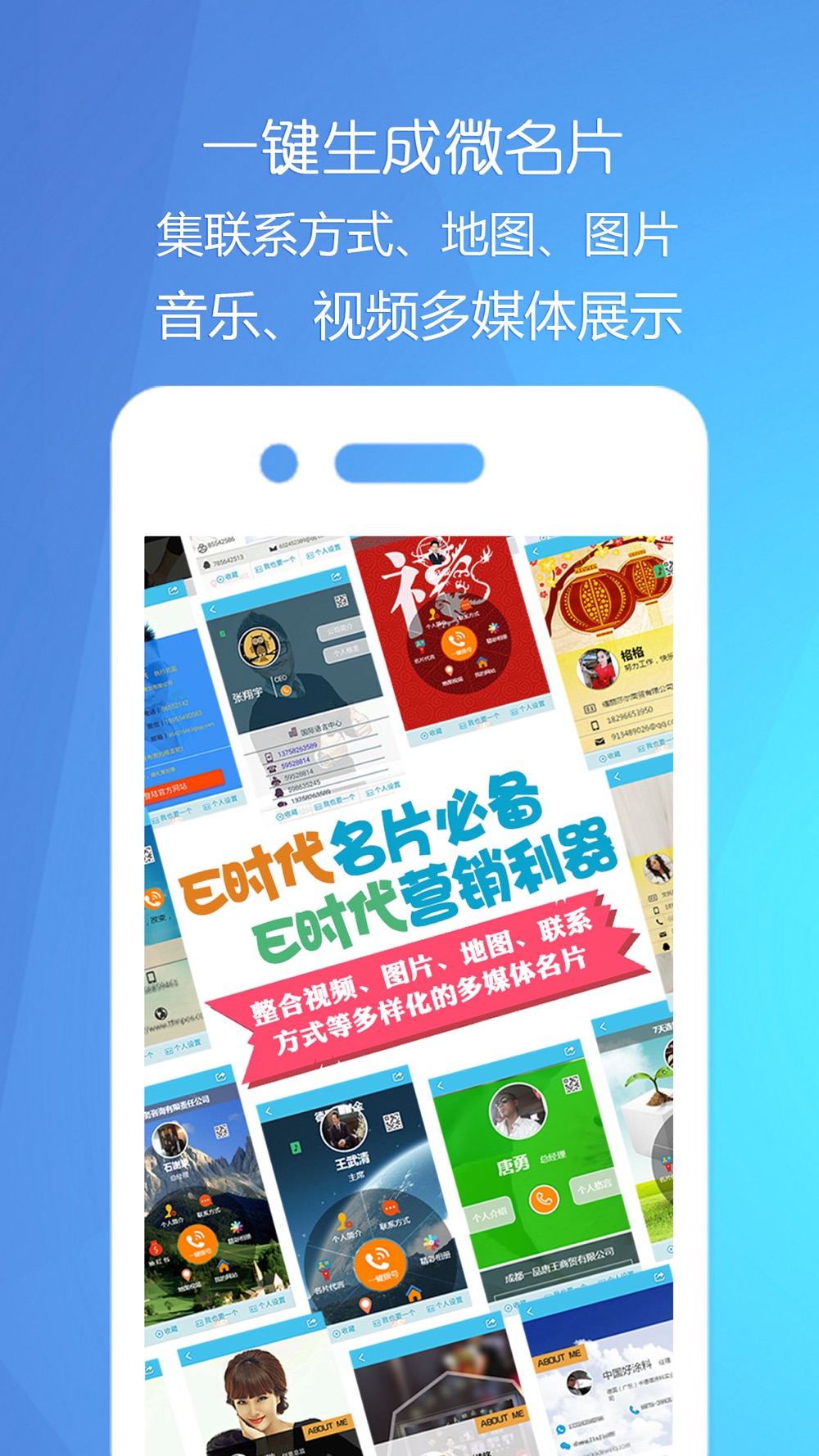 E企营首先为企业每个员工配制一套电子名片,名片可生成二维码用于线上线下互动展示,可将名片二维码直接印于线下的纸质名片或是宣传页上,客户通过扫描二维码可以打开电子名片,因电子名片可含图片、视频、电子地图、音乐等多媒体属性,所以可以很直观的展示企业形象或是产品,更好的传达企业需要传达给客户的内容。在电子名片的基础上使用企业通讯录与个人通讯录可以更好的实现企业内部互通与工作效率。