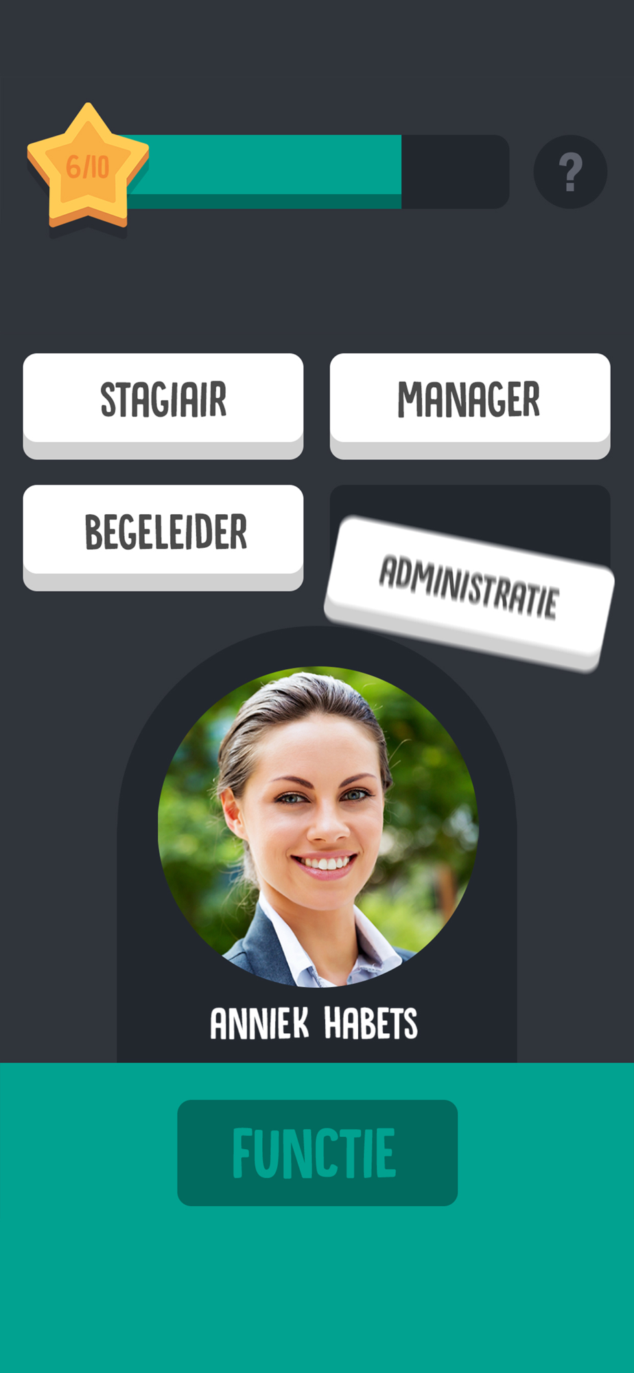 Level 2 - Wie is wie In het tweede level koppelen spelers de juiste functie aan de juiste medewerker. Daarnaast koppelen spelers een specifieke vraagstelling aan de medewerker die hierover gaat.