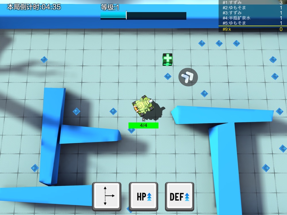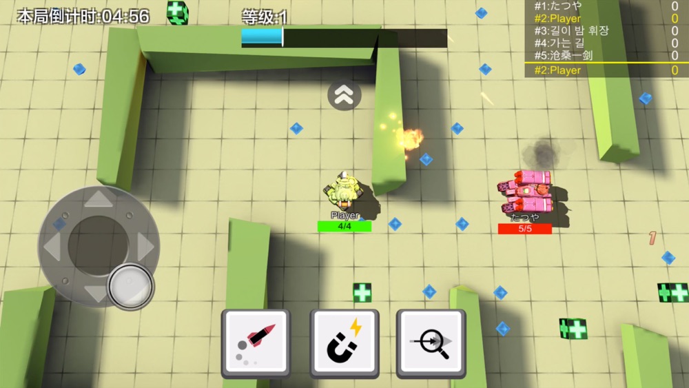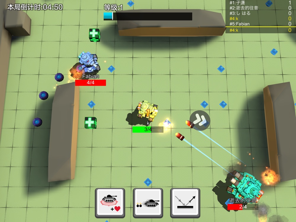 1.通过虚拟摇杆控制走位,利用手中的坦克发射炮弹击败对手;
