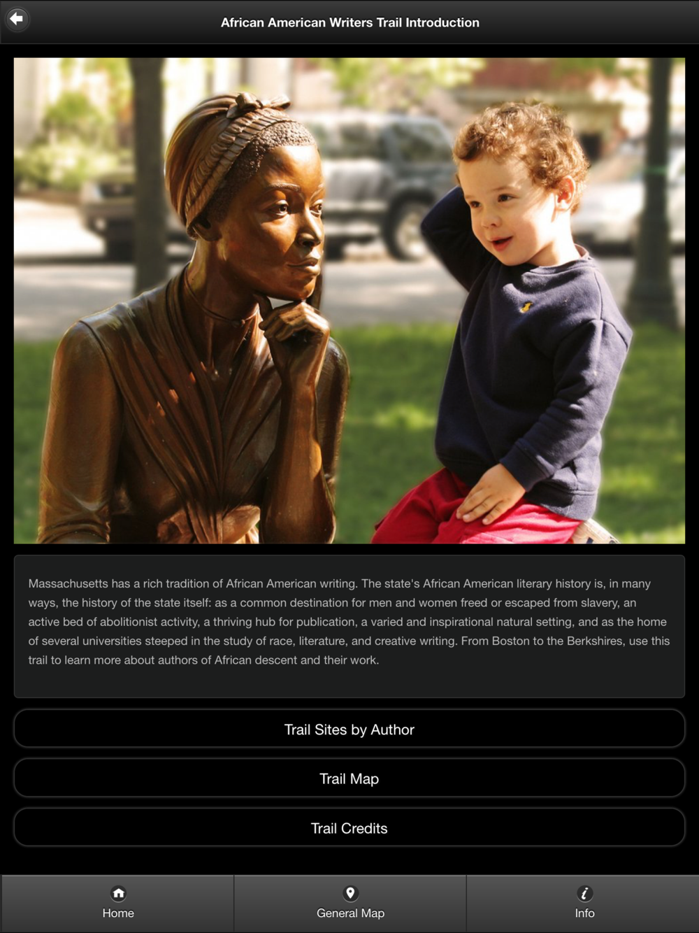 MassBook Trails is a travel and tourism app that provides local walking tours and statewide trails which make the literary culture and history of Massachusetts come alive. Photos, links, and maps, often augmented with audio or video, provide lively and engaging details about creative life in the Commonwealth, past and present. Stroll through literary Beacon Hill and other book-centric neighborhoods, visit the homes of Louisa May Alcott, Herman Melville, Nathaniel Hawthorne, Edith Wharton, and many others. Learn about Phillis Wheatley, Lucy Terry Prince, and other early African American writers. Take in the lively exhibits of the Eric Carle Museum of Picture Book Art or the Museum of Printing. Wherever you travel with this app, you will discover the deep and extensive culture of books and reading, literacy and libraries in a Commonwealth which includes, in its Constitution, a provision "to cherish the interests of literature."