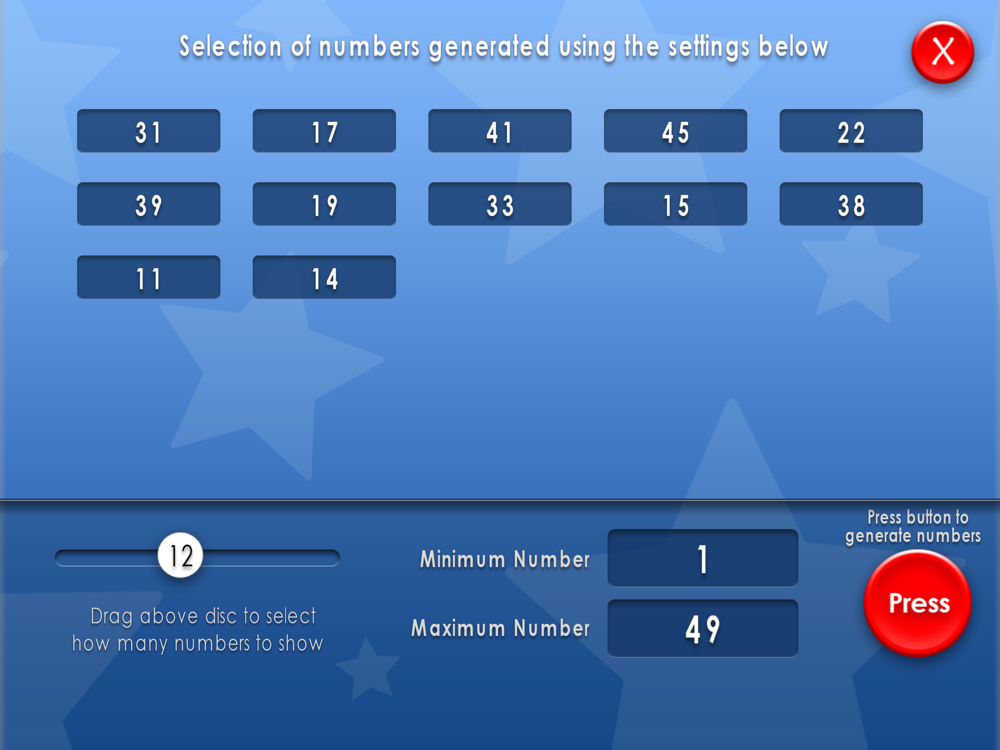 There are 4 different modes, 'Spin The Wheel', 'Lottery', 'Keno and Bingo' and a set of 'Random Numbers'