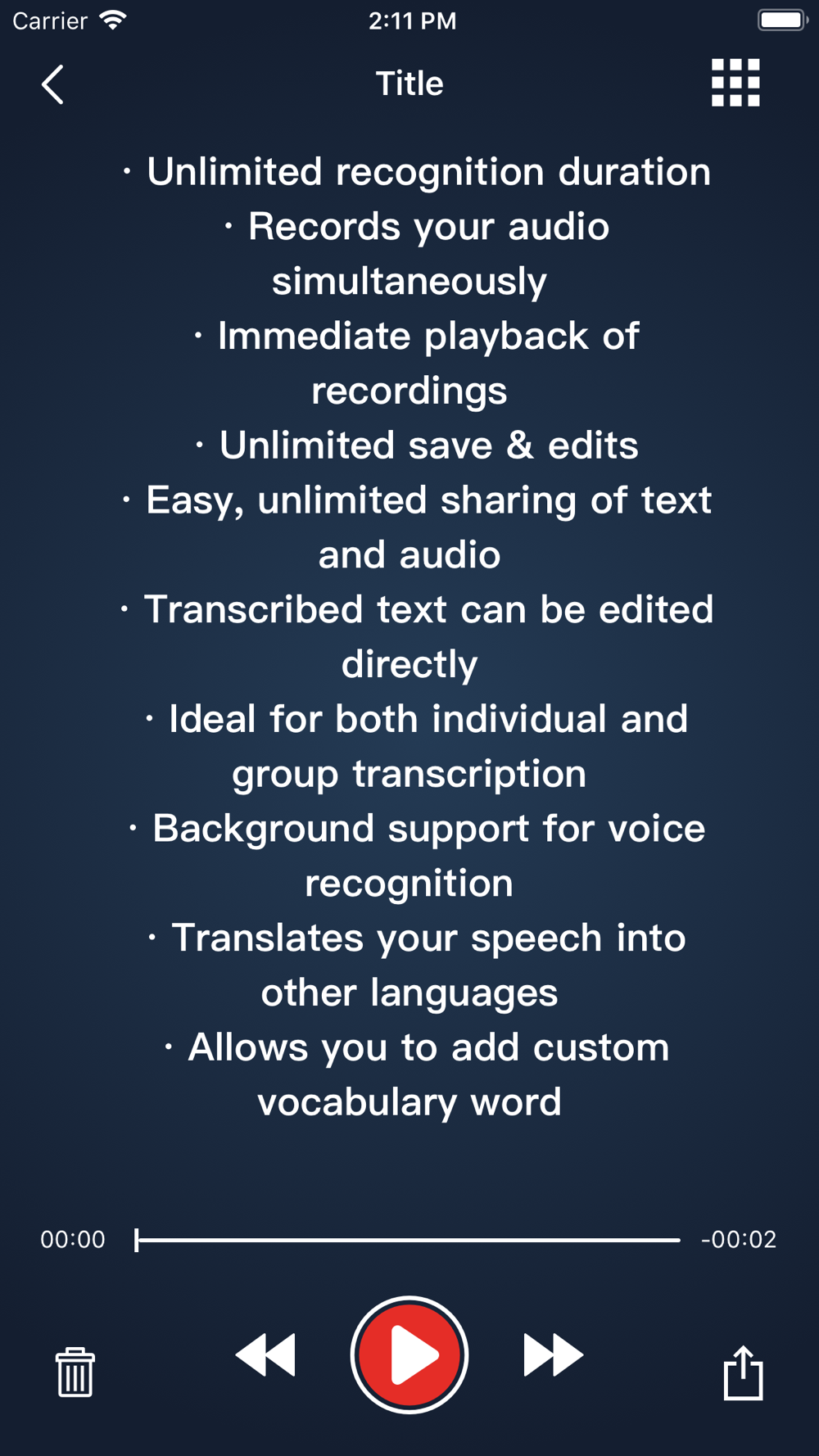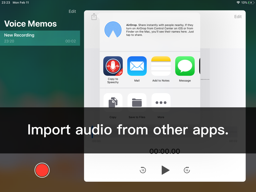 Speechy not only transcribes your words, but also records your VOICE so you can refer to the original recording later! Plus, you can easily share your text and audio files later! (Works with Evernote, Dropbox, Google Drive, OneDrive, Facebook, Twitter, Snapchat, WhatsApp and other iOS supported sharing apps.)