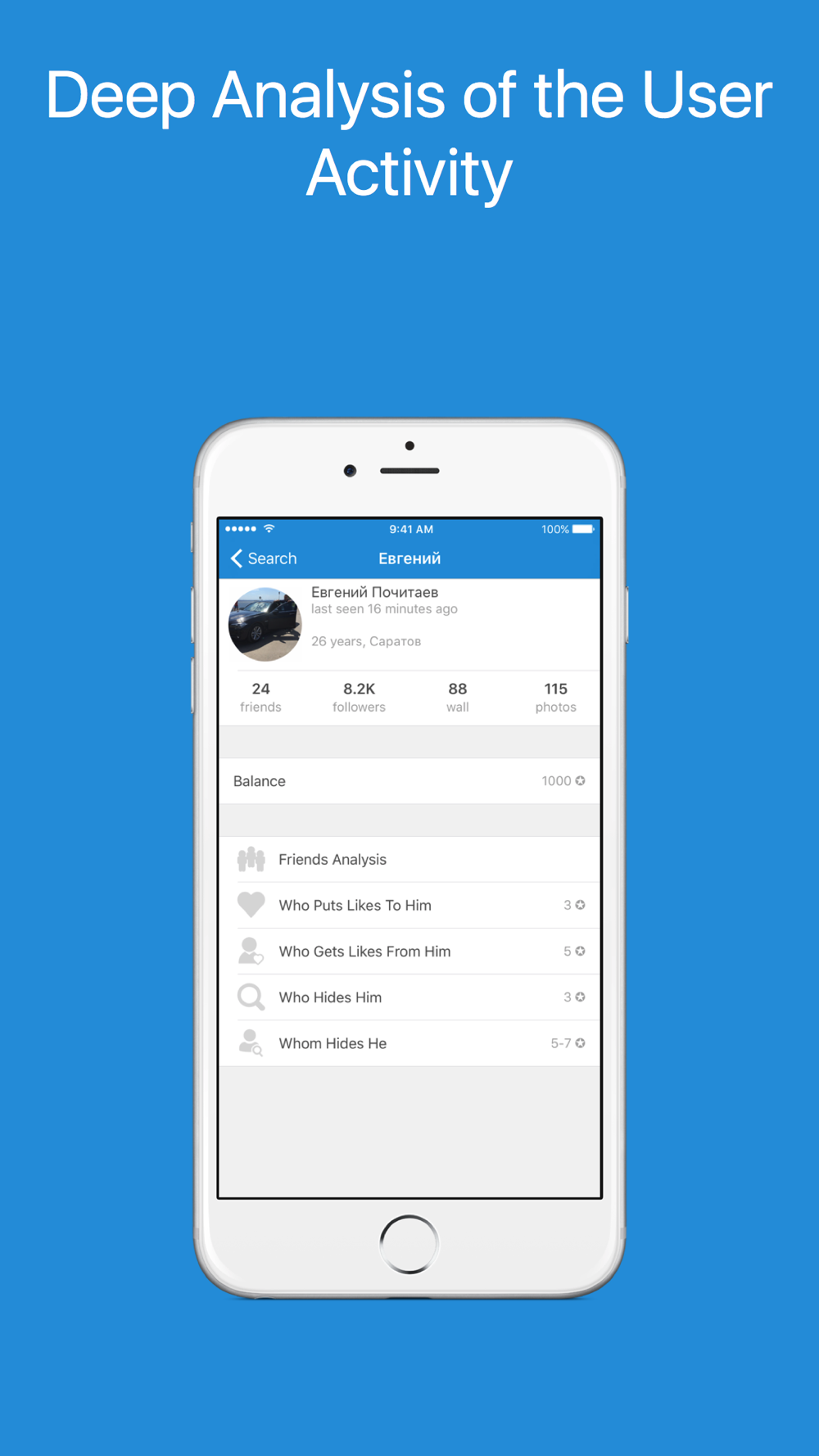 A unique application for analysis of user profiles for VK social network, based on an analysis of public activity of users.