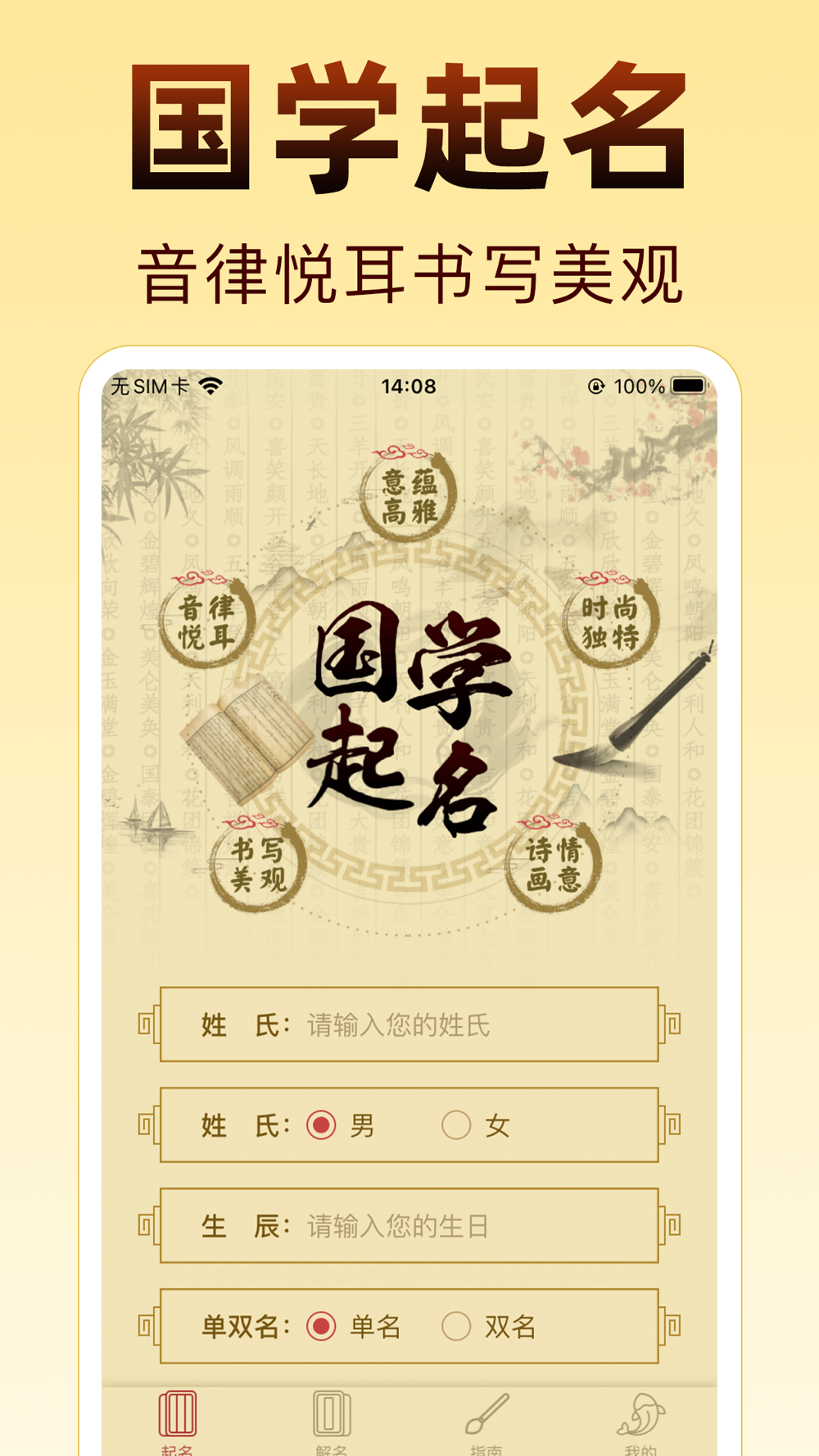 经过多年线下起名服务的积累,我们研发出了符合华人审美,同时音、形、意俱佳的起名APP——国学起名。