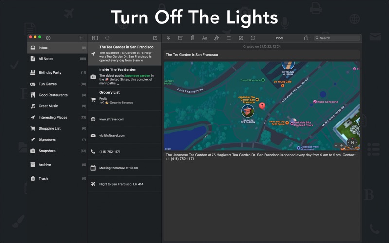 • Notes can be customized with a variety of formatting options (checkboxes, lists, colors, headlines and much more)