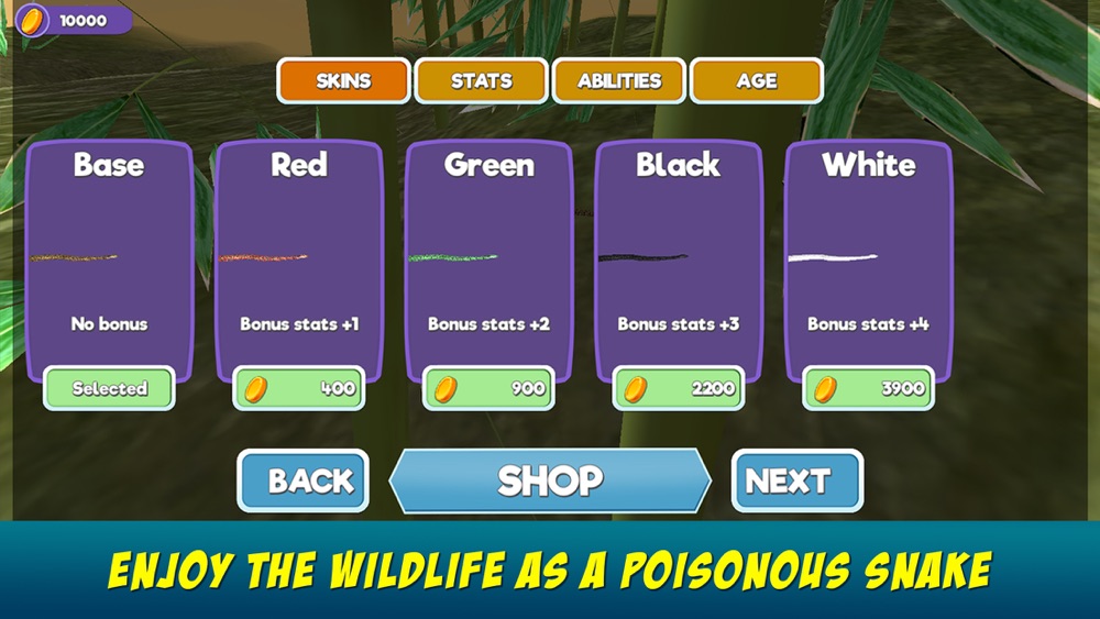 为成功完成的不同任务赚取积分,并为您的蟒蛇打开新的有趣的皮肤 - 蟒蛇,俾斯麦戒指蟒蛇,白唇蟒,磨砂蟒蛇,网状蟒蛇,甚至绿树蟒蛇 - 或强化其特征!喂你的蟒蛇,它的家庭正常,与其他非洲动物战斗,扩大你的氏族,成为这些地方最强大的巨型食肉蛇!