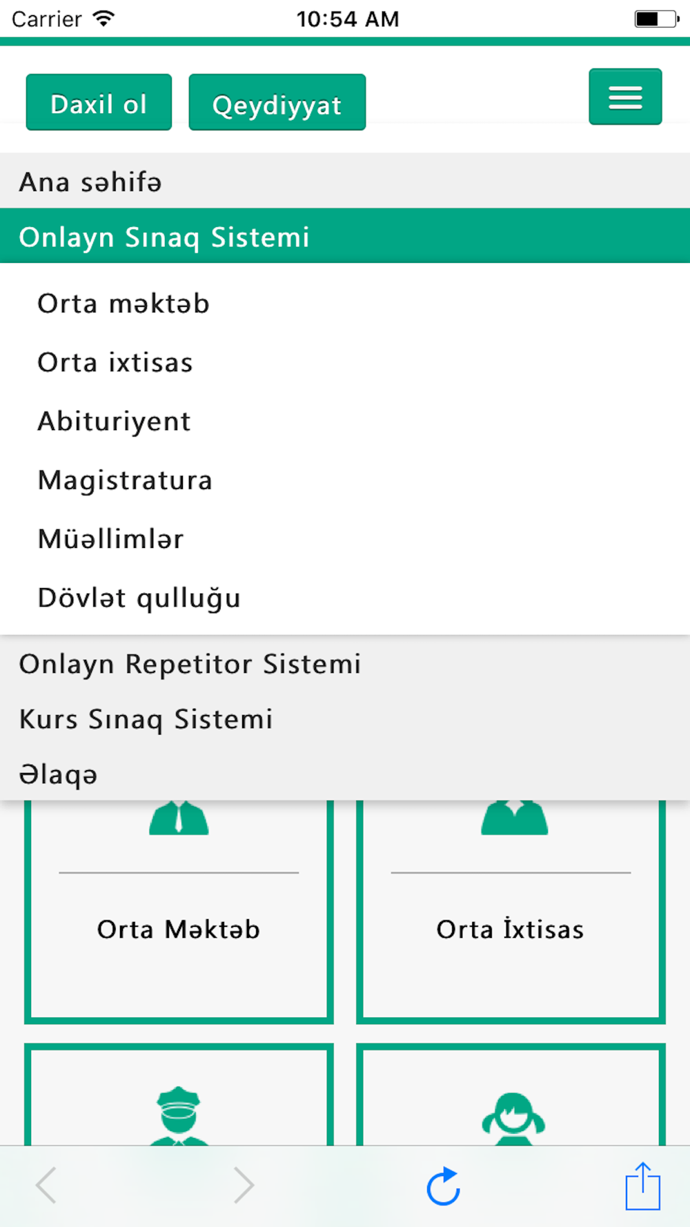 Mobil tətbiq Onlayn Sınaq Sistemindən, Onlayn Repetitor Sistemindən, Kurs/Məktəb Sistemindən və Dinamika bölməsindən ibarətdir.