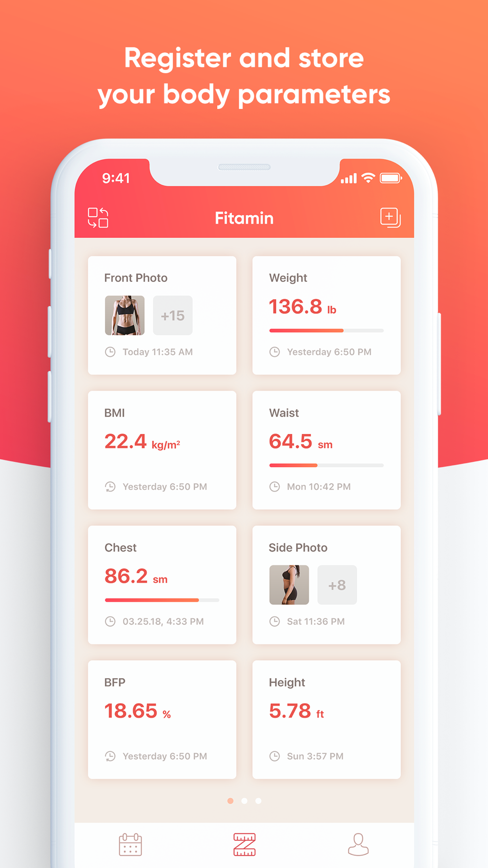 Fitamin is an indispensable application for everyone who wants to be in shape, regardless of whether you want to control your weight, keep a diet or exercise in the gym to gain muscle mass. You no longer need to record your body measurements on paper or use several different instruments – Fitamin makes it possible to store all the parameters of your body in one place and always near you!