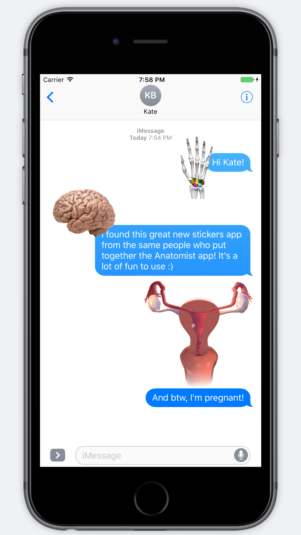 From the makers of the Anatomist app – the #1 anatomy quiz app on the App Store – comes a great new set of 125 anatomy stickers to use in iMessage! Anatomy Stickers is the first stickers app of its kind and is lots of fun to use. Send the images alone in messages to friends, classmates, or colleagues, or stick them to individual messages to add some anatomy fun to your conversations.
