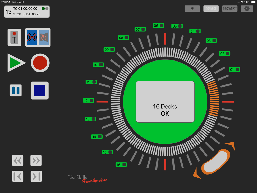 The HyperSynchron Deck Supervisor monitors up to 16 Decks and informs you when an error or a critical situation occurs on one or more Decks, optionally using voice output. Use the innovative Jog/Shuttle tool to control your playback. Setup your decks in the deck popup, format your storage media, set the base file name and see the clips contained on the media storage. Set the record timer to start and finish a recording automatically.