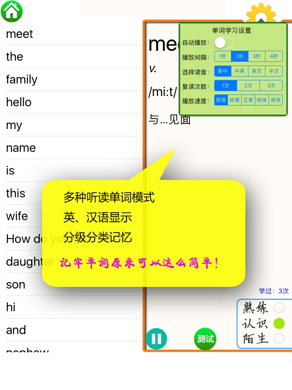 ■播放功能科学,可以随意播放课文中的单词、句子等。可设置多种播放复读模式。可以慢播、快播。