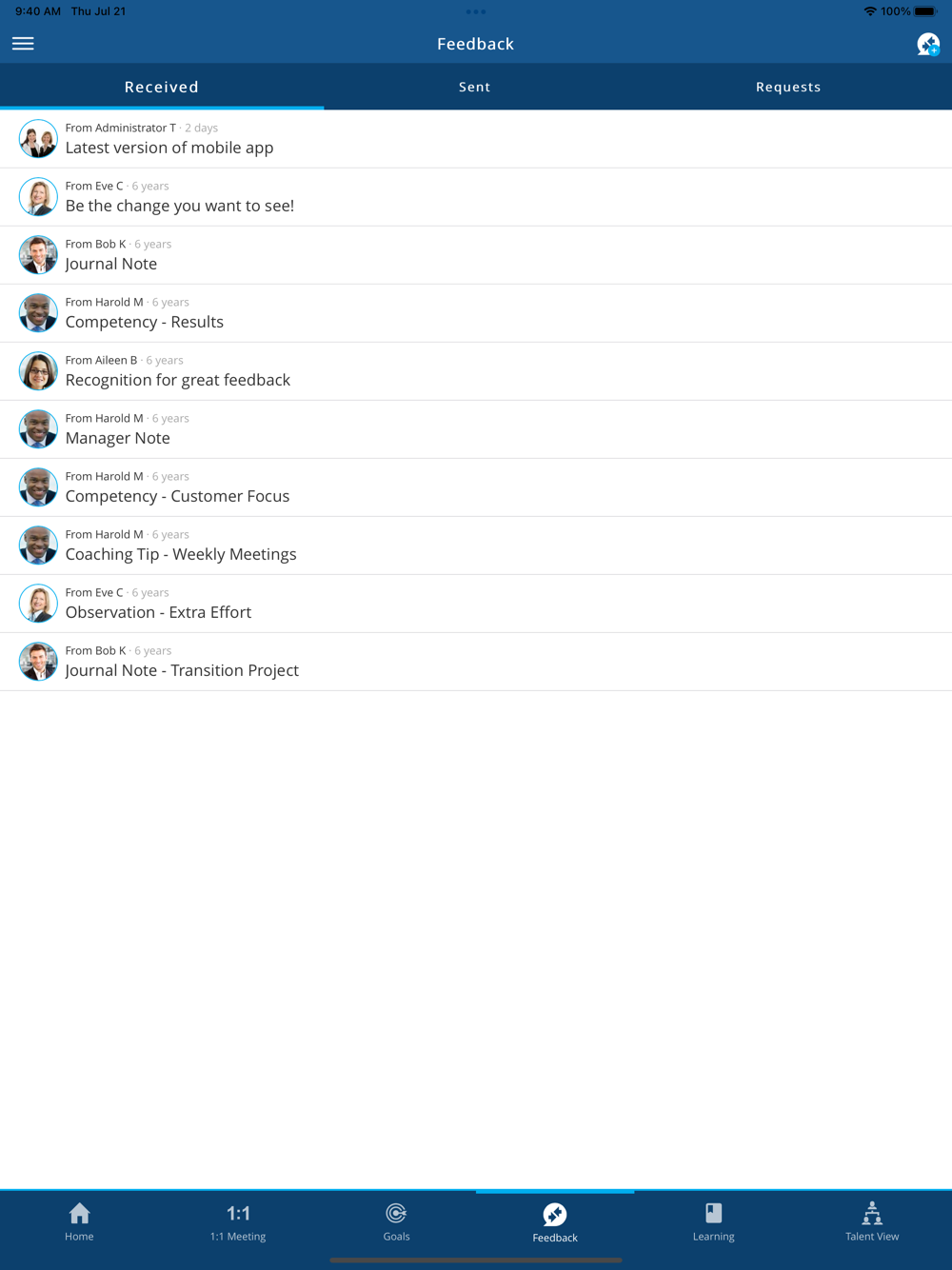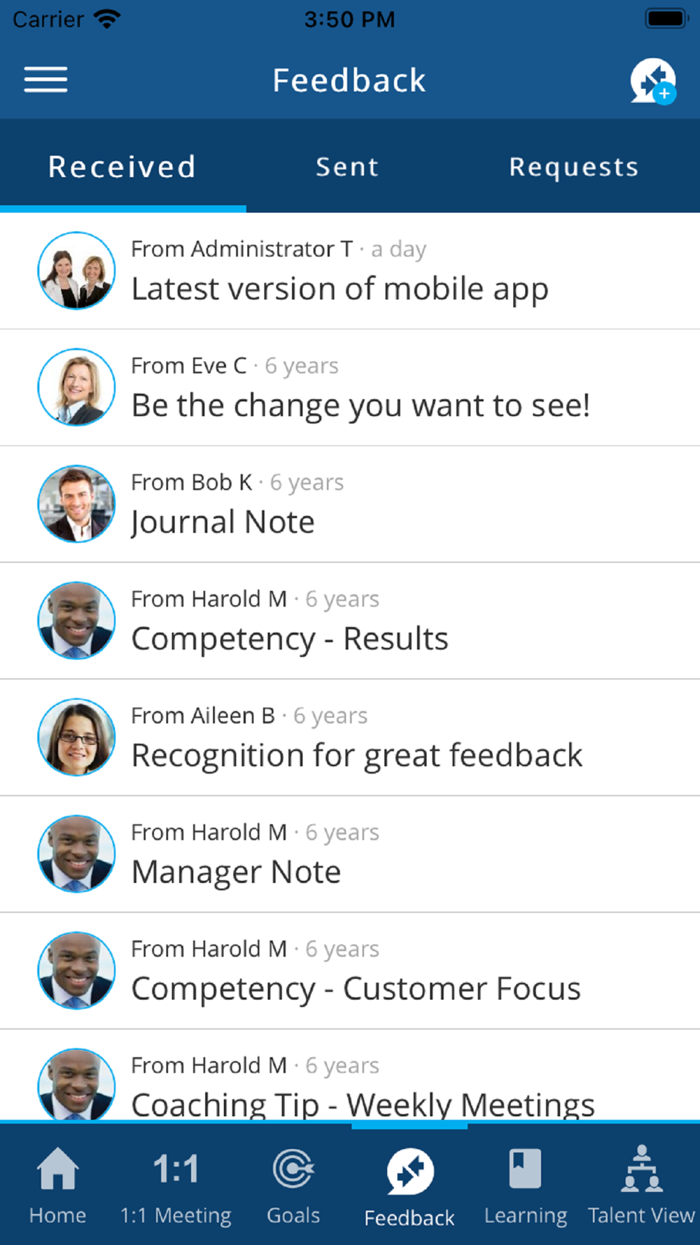 The Saba TalentSpace mobile app provides an extension of our Feedback, 1:1 Meeting, Learning and Talent View capabilities available in Saba TalentSpace. This free app gives end users an easy way to send and receive feedback, get tips and reminders on providing effective feedback, encourage and track 1:1 dialogue, access learning, work with goals, and connect with colleagues across the organization – all from a smartphone!