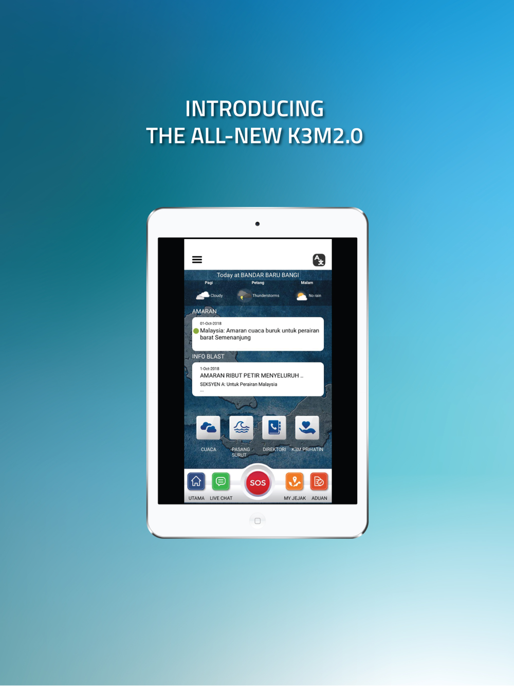 “Kesedaran Keselamatan Komuniti Maritim” (K3M) refers to Maritime Community Security and Safety Awareness. This innovative mobile application allows the maritime community to lodge reports or request emergency assistance directly to the Royal Malaysian Navy (RMN) Operation Centre or the Malaysian Enforcement Agencies (MMEA).