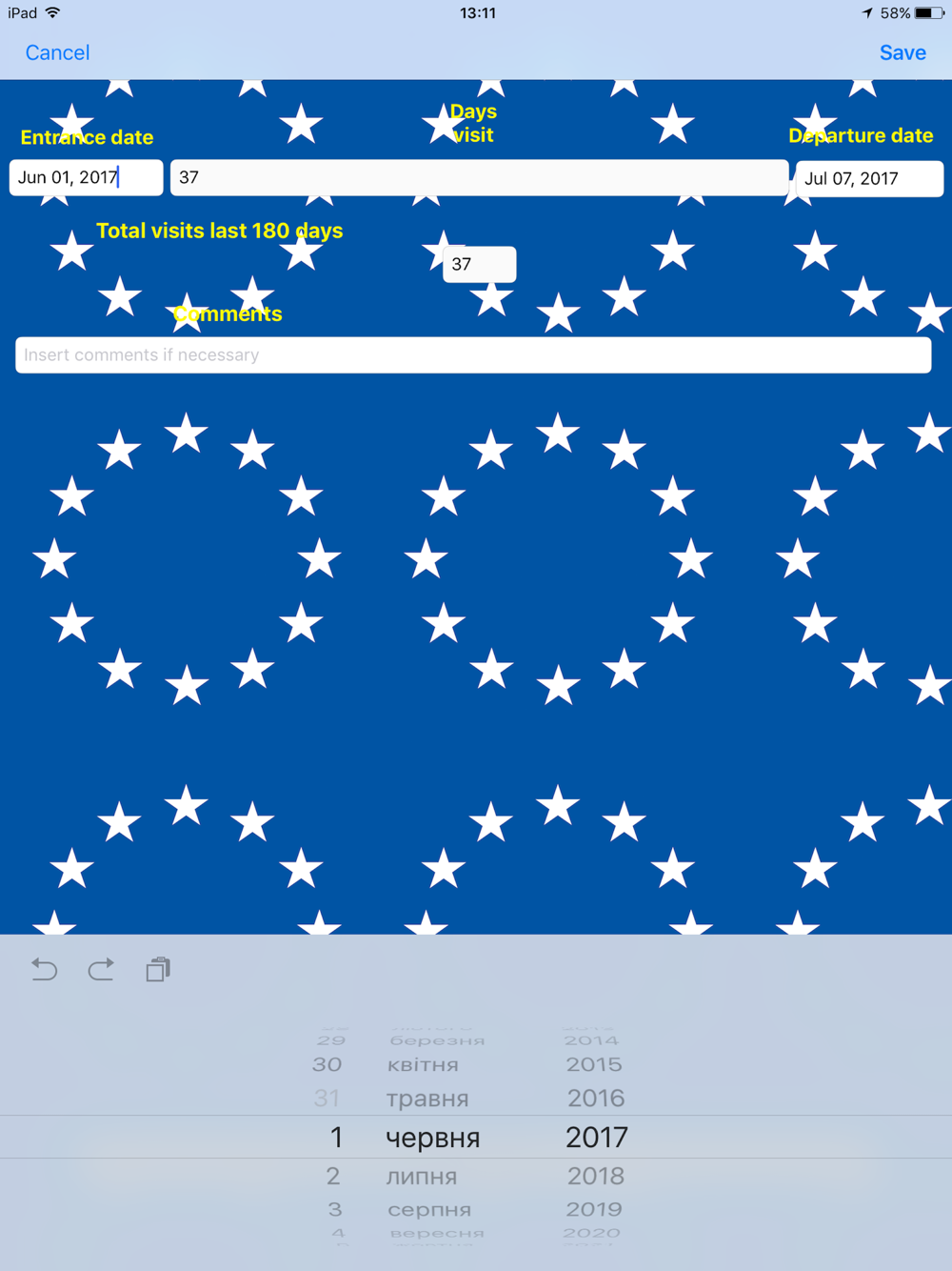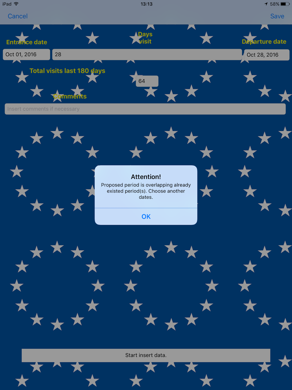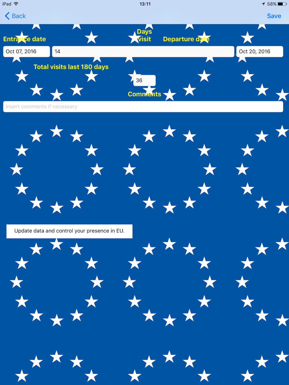 App is designed for frequent travelers in Europe who have to fulfill the requirement - terms of present in Schengen area - not more than 90 days during any 180 days interval.