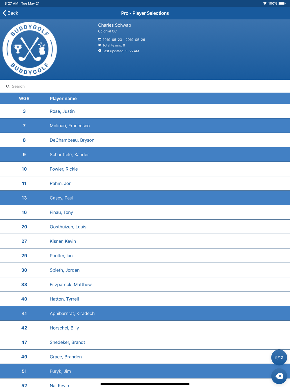 The BuddyGolf app allows you to compete against each other each week in the PGA tournament and the European tour by selecting your favorite players for each tournament.