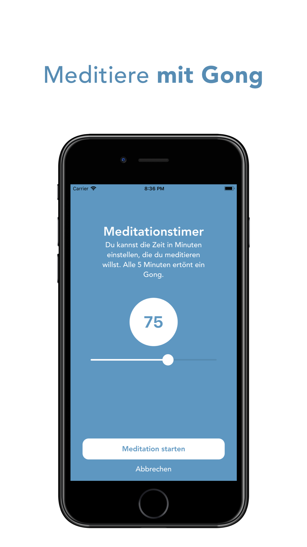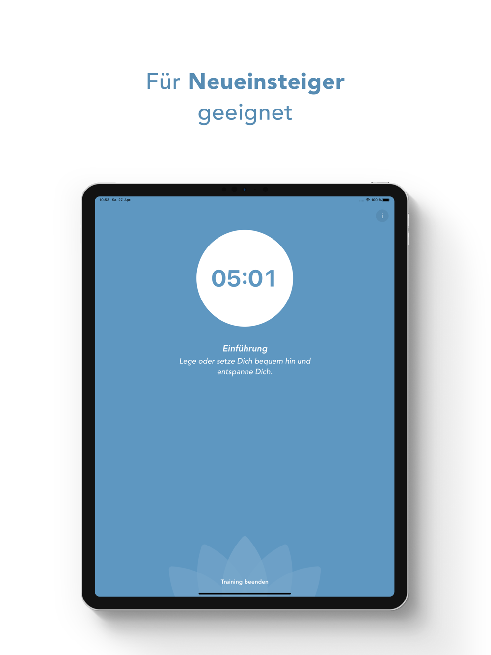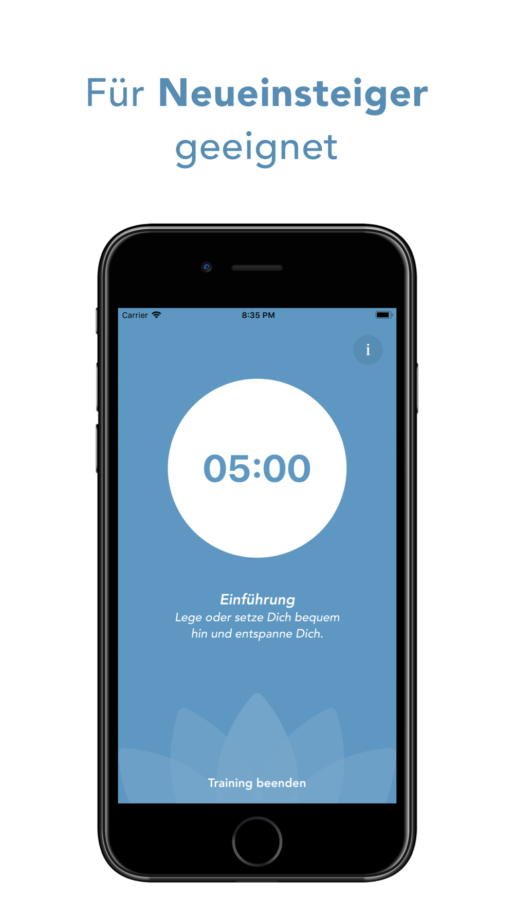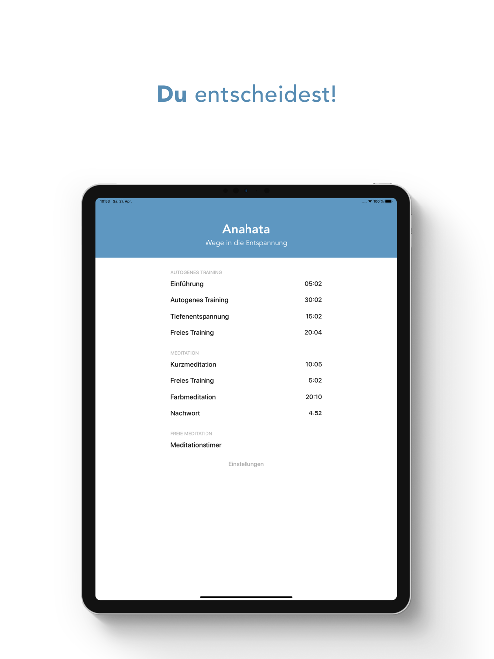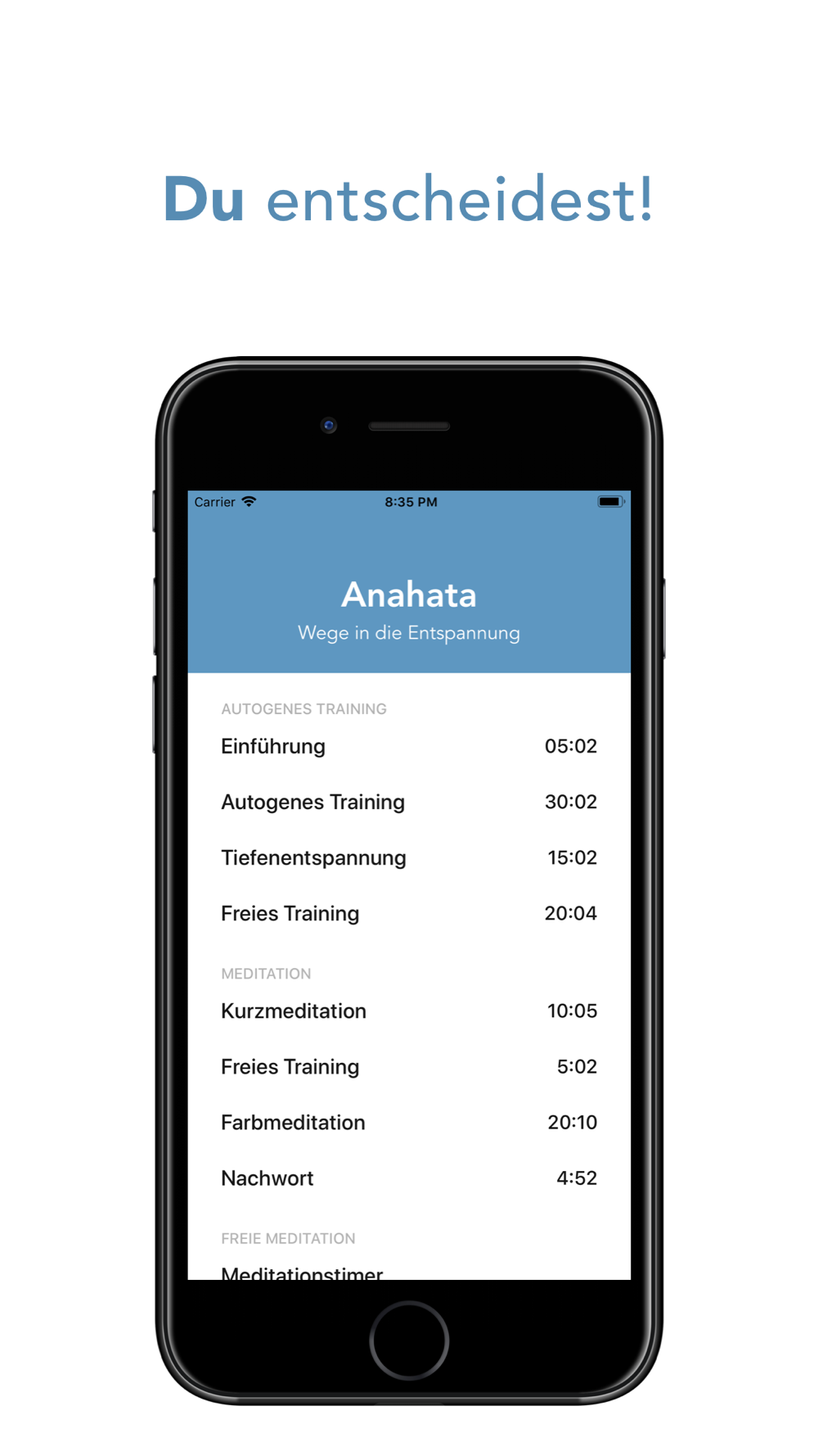 Neben der Einführung (5 min) und dem freien Training (20 min) bietet die App außerdem ein geführtes Autogenes Training (30 min) und eine geführte Tiefenentspannung (15 min).