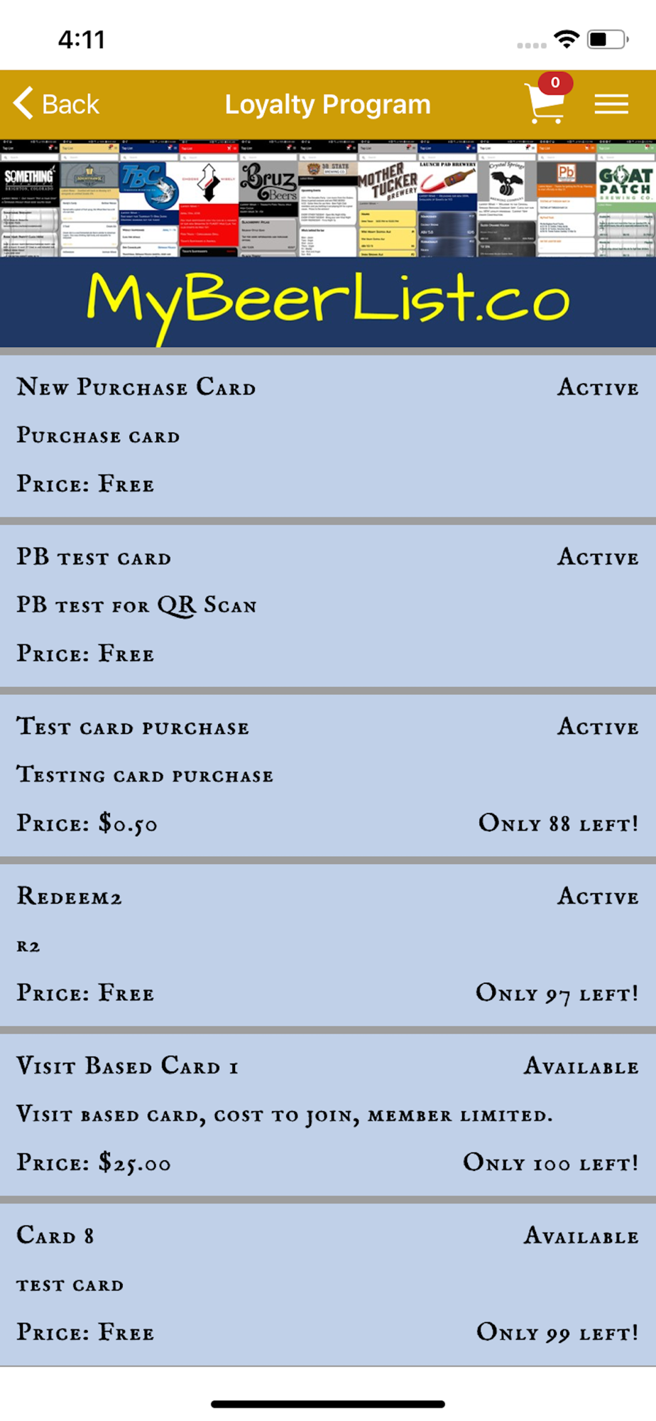 2. Loyalty Programs: This provides the brewery the ability to create loyalty cards within the application. Cards can be either visit based (QR Scan), or purchase based (driven by purchases from the app). Cards can be linked such that Card B requires graduation from Card A. Number of cards is not limited.