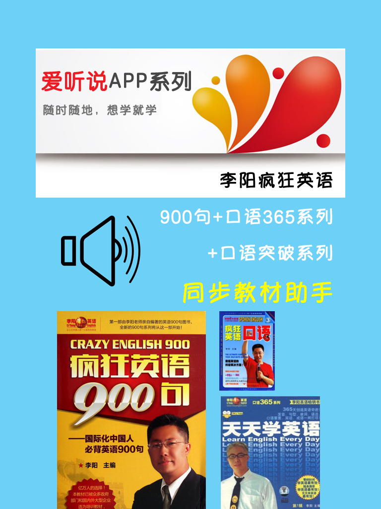 本软件配套李阳疯狂英语的 《900句-国际化中国人必背英语900句》、《口语365系列-天天学英语》与《英语口语第1-3辑》最新教材。