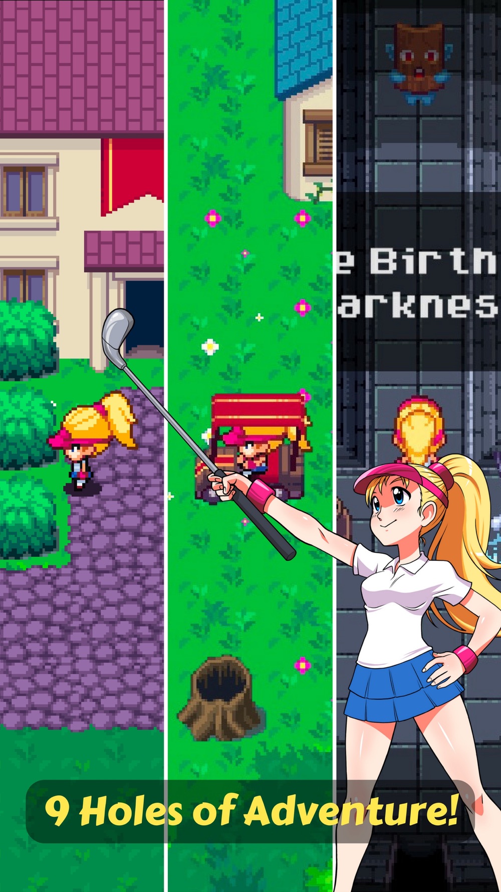 Then one day, a brave girl appeared, determined to play the finest course in the world. Armed only with her golf club, she would set forth to play the nine legendary holes. But first, she would need to rid the land of the monsters...