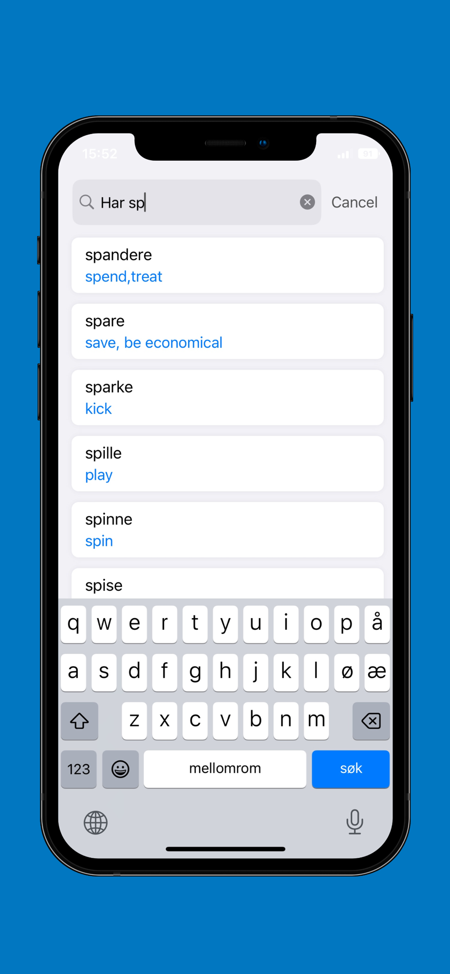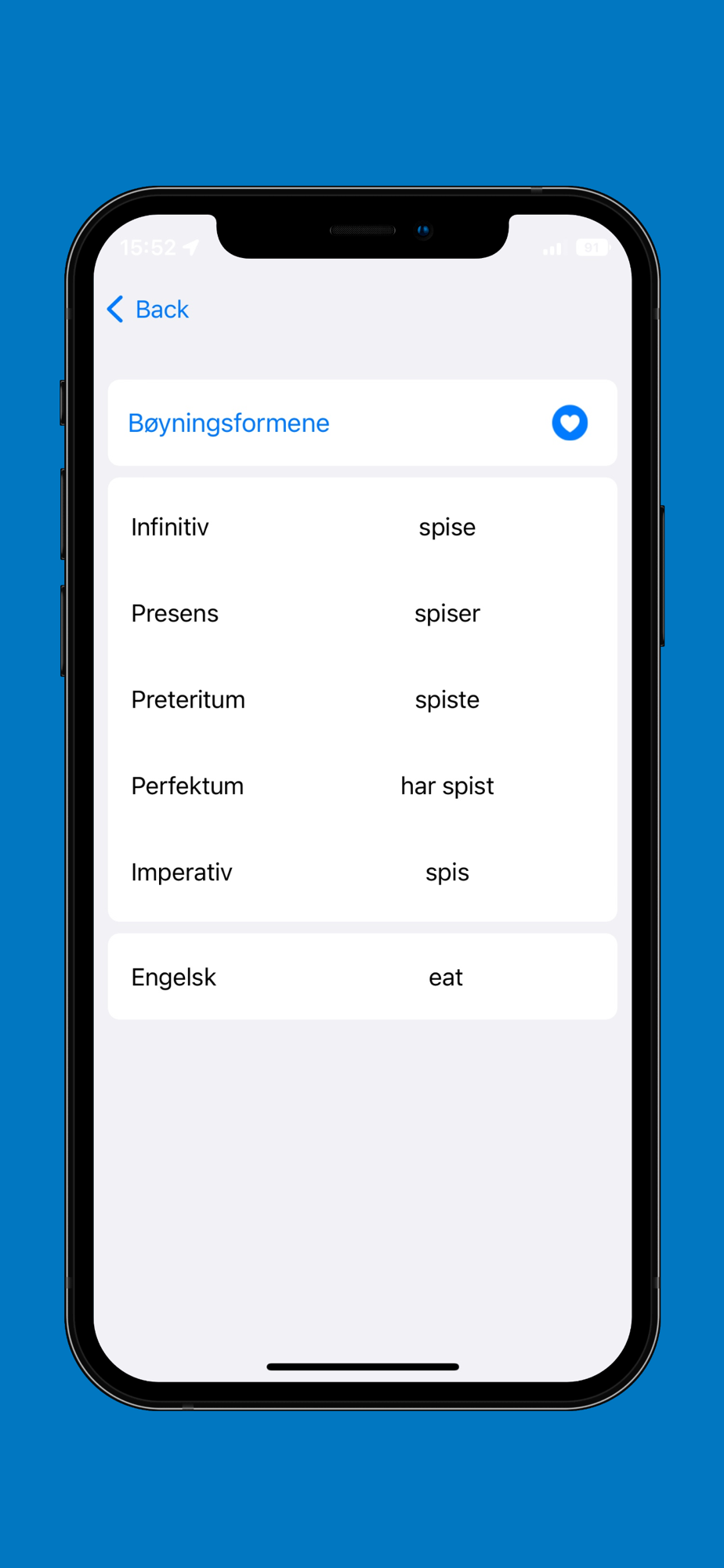This is Norwegian Verb Dictionary (Norsk VerbOrdbok). The app containing over 600 Verbs. This is the perfect ‘kick -starter’ App for learning those difficult verbs and conjugation.