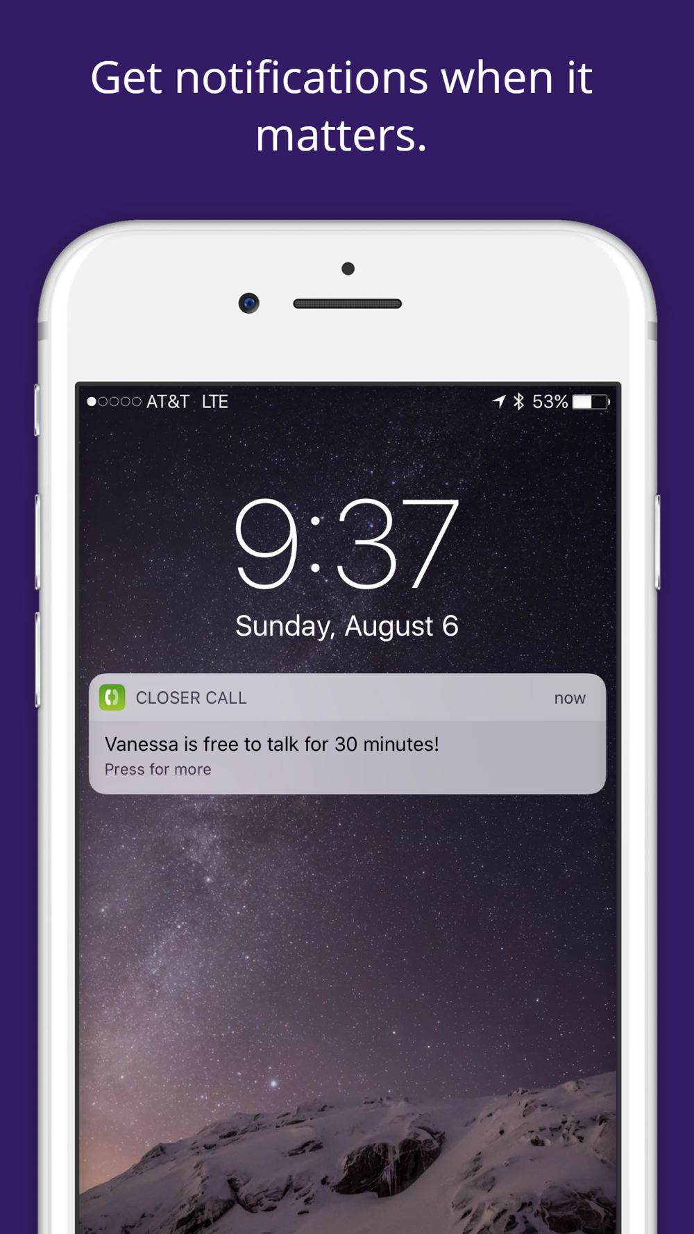 The truth is we don't speak to our friends and family nearly as often these days as we're afraid of interrupting each other. Closer Call solves this problem by allowing you to easily see when each other is free to talk and for how long so you can catch up more often and enjoy feeling more connected. Closer Call is especially useful for people living a long way away from friends and family.
