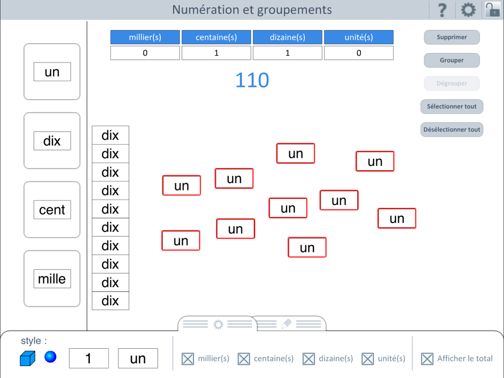On peut alors effectuer des groupements par dix, cent, mille, sélectionner ou désélectionner des blocs, ajouter ou supprimer des objets, etc. Ces modifications apparaissent dans le tableau de numération affiché à l'écran.