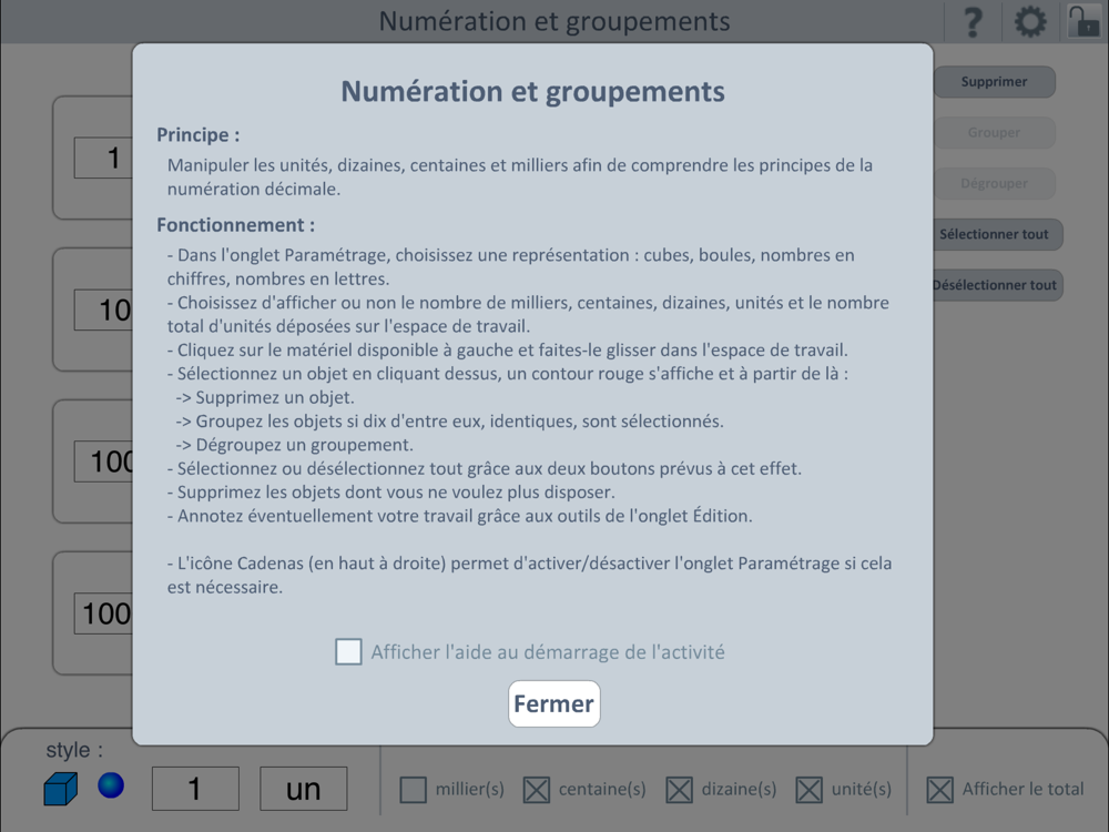 Cette application permet de comprendre la numération décimale (unités, dizaines, centaines, milliers) en manipulant concrètement différents matériels.