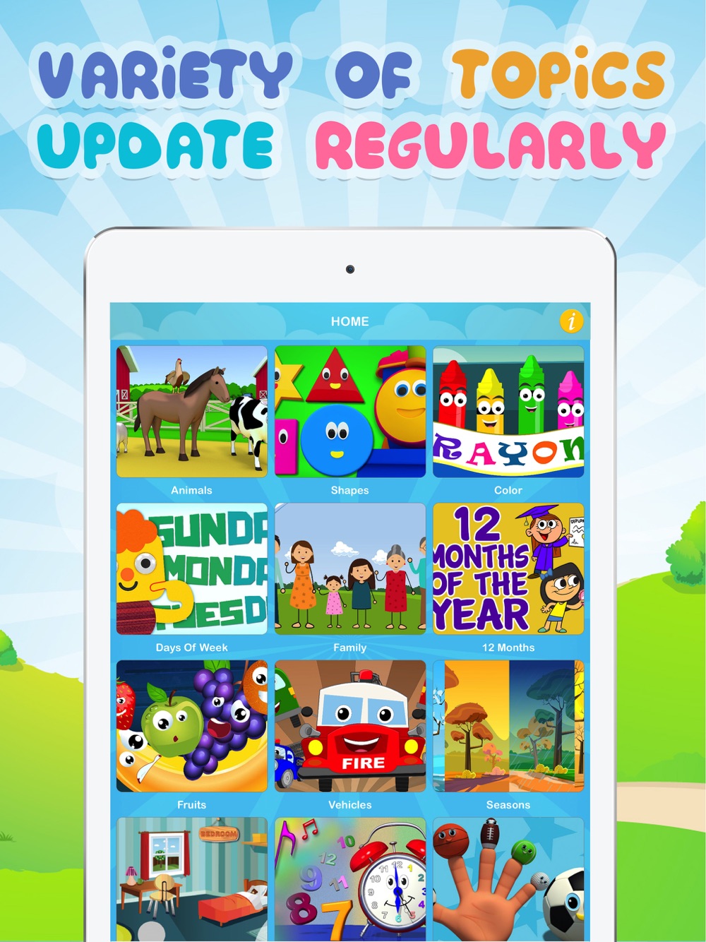 您可以享受视频音乐和歌曲,幼儿歌曲,字母歌,童谣等喜欢的喜爱,还有其他任何他们喜欢的东西,运动,动物,游戏和超过20多个主题与1000多个视频。