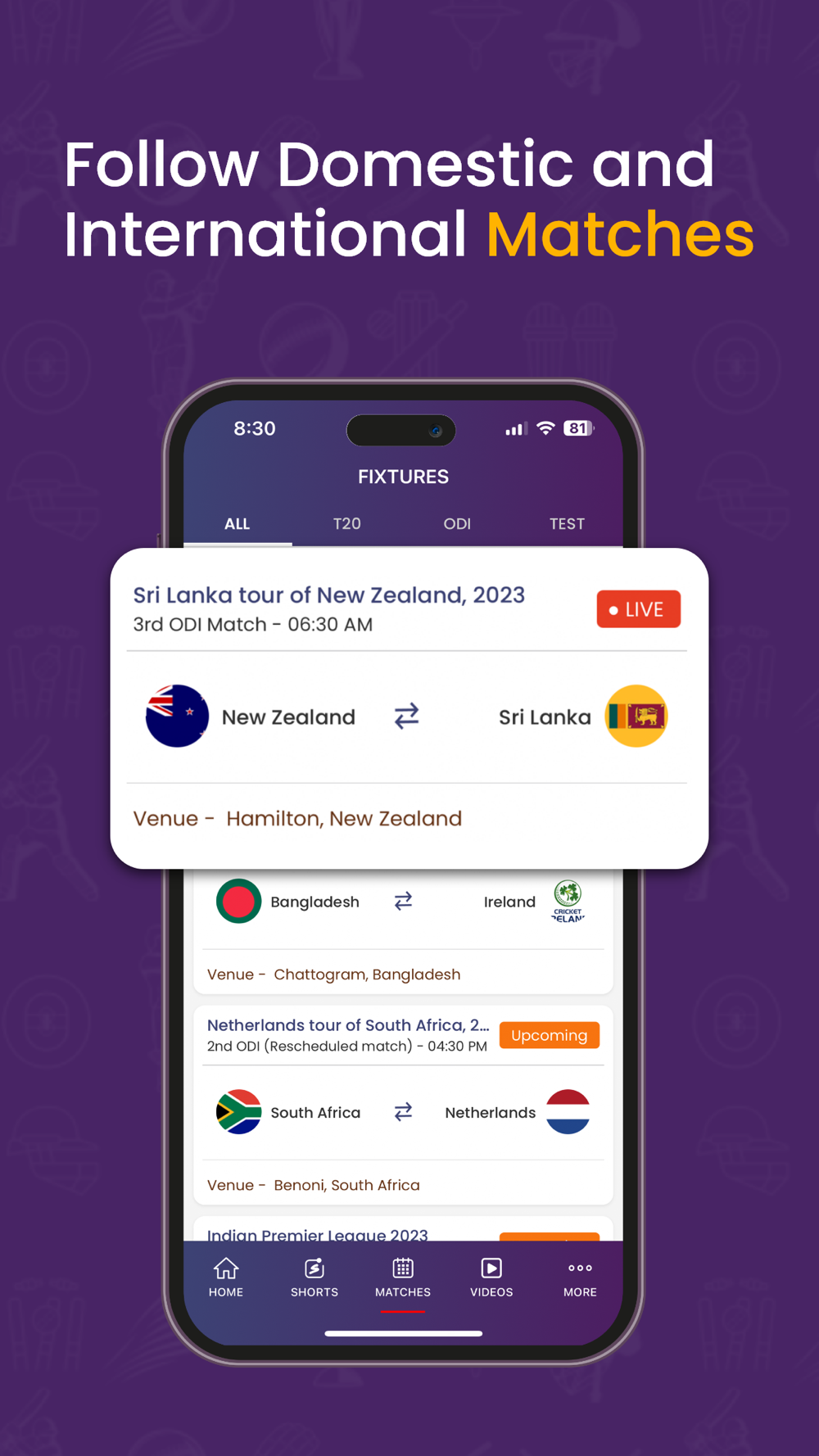 - Alerts & notifications of live and upcoming matches.