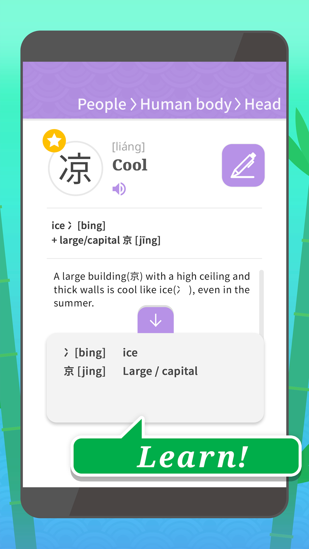 This app will help you to make sense of the structures of Chinese characters. With 250 basic and radical characters, you can combine or break them apart too easily read, write and understand Chinese characters. It also offers many other services for more effective learning. Please see details below.