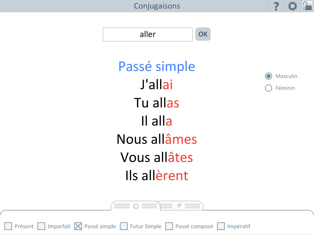 Cette application permet d'afficher les conjugaisons de plus de 7000 verbes aux différents temps pratiqués à l'école primaire. Elle sera particulièrement utile aux élèves pour les exercices de conjugaison et de grammaire, la dictée, l'expression écrite.