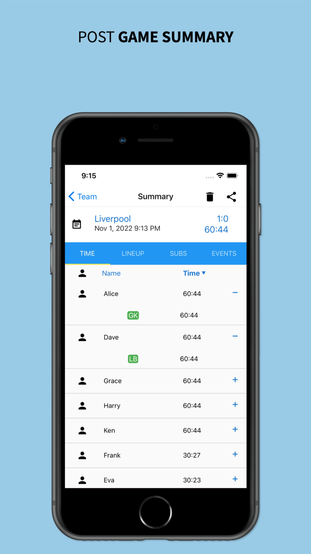 Subtime supports multiple teams and can auto-save game history for you. You can even export a game playtime summary for your records. And don't worry if you coach multiple sports, Subtime supports soccer/football, basketball, lacrosse, field hockey, and rugby.